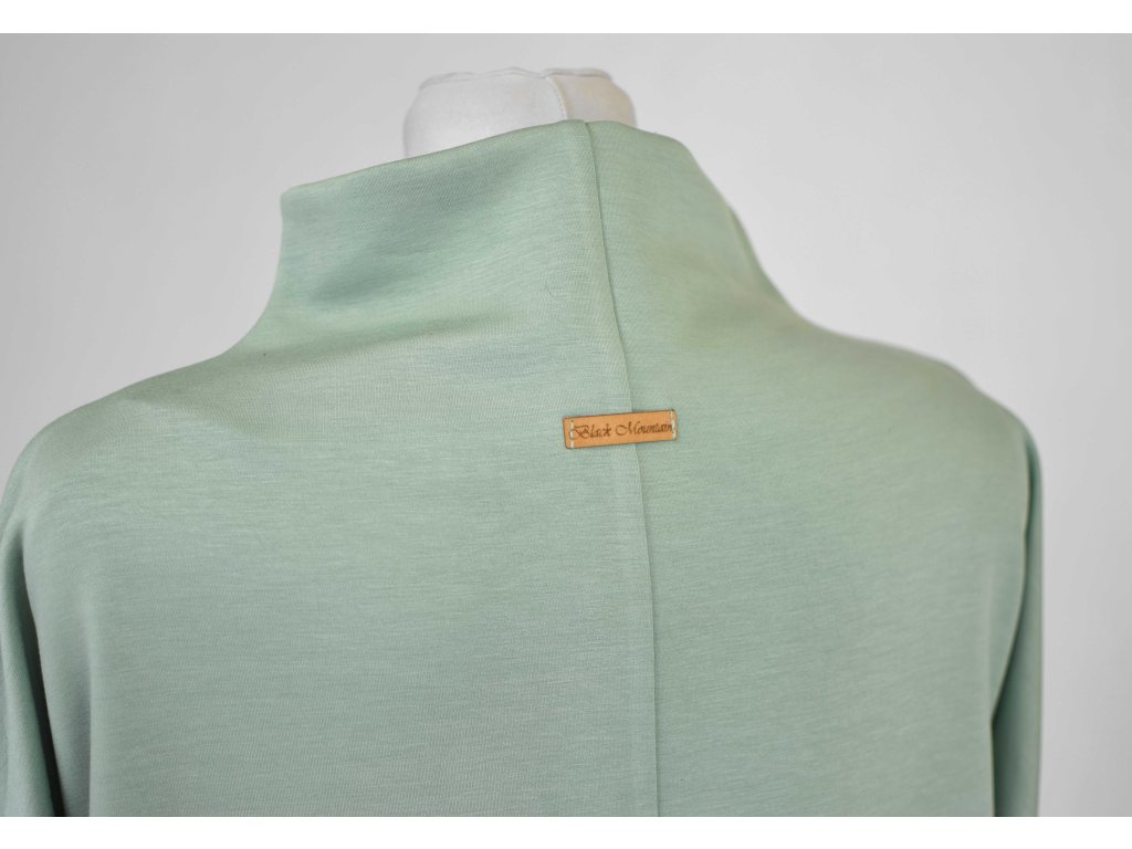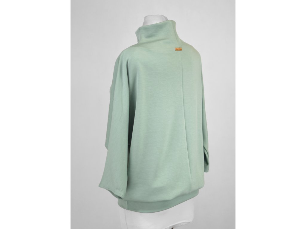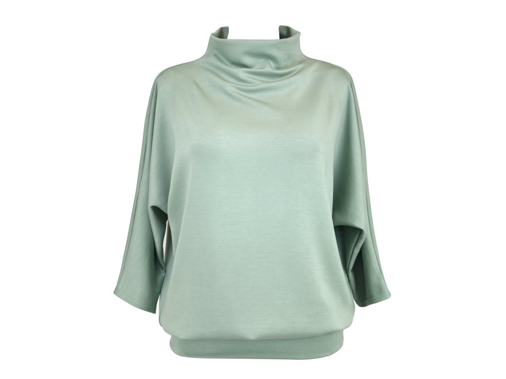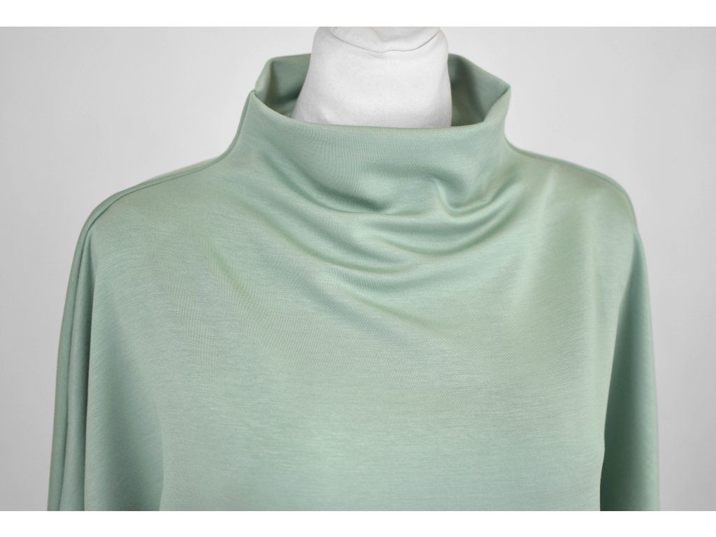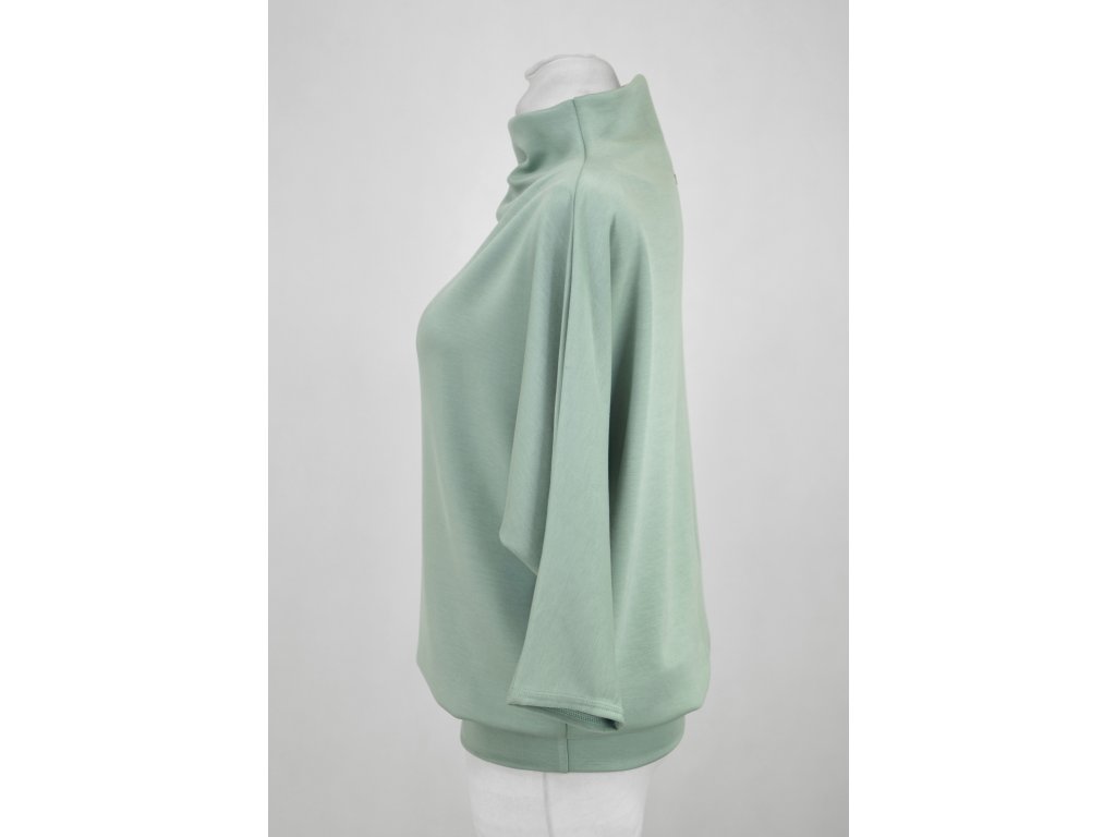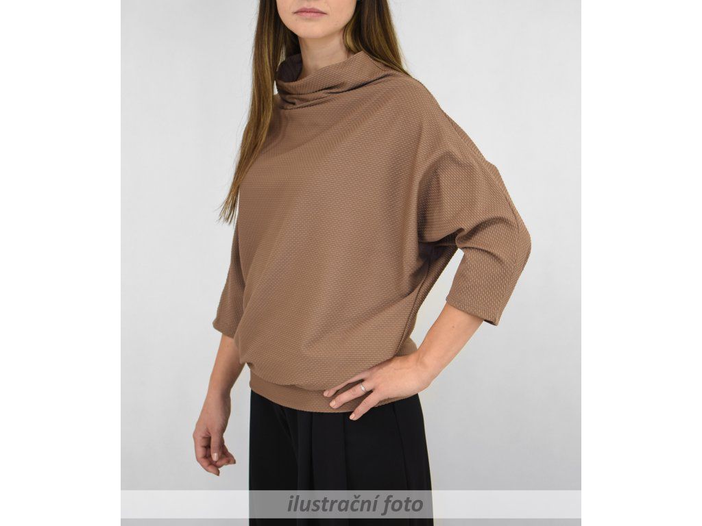 Dámská halenka netopýřího střihu s volnějším dvojitým stojáčkem. Rukávy jsou netopýřího střihu, 3/4 délky. Je s volným hrudníkem a je podkasaná do dvojitého lemu v dolním okraji. Působí volně a ležérně. Dá se nosit jako svrchní vrstva, zároveň ji však můžete nosit i samostatně jako tričko.