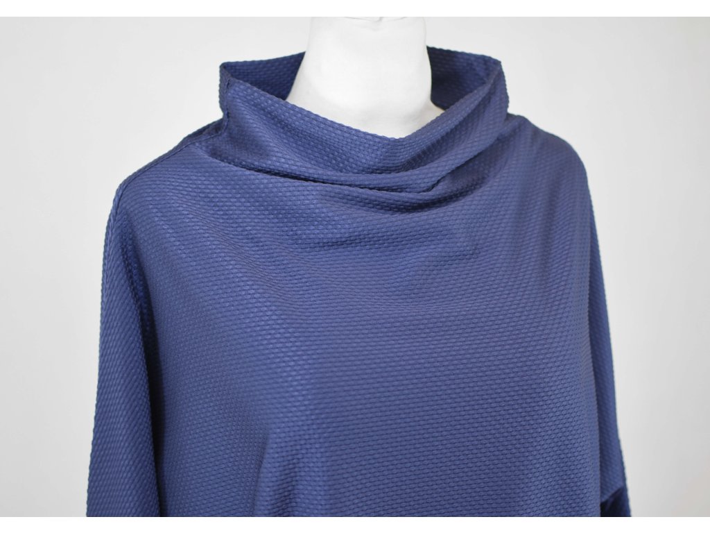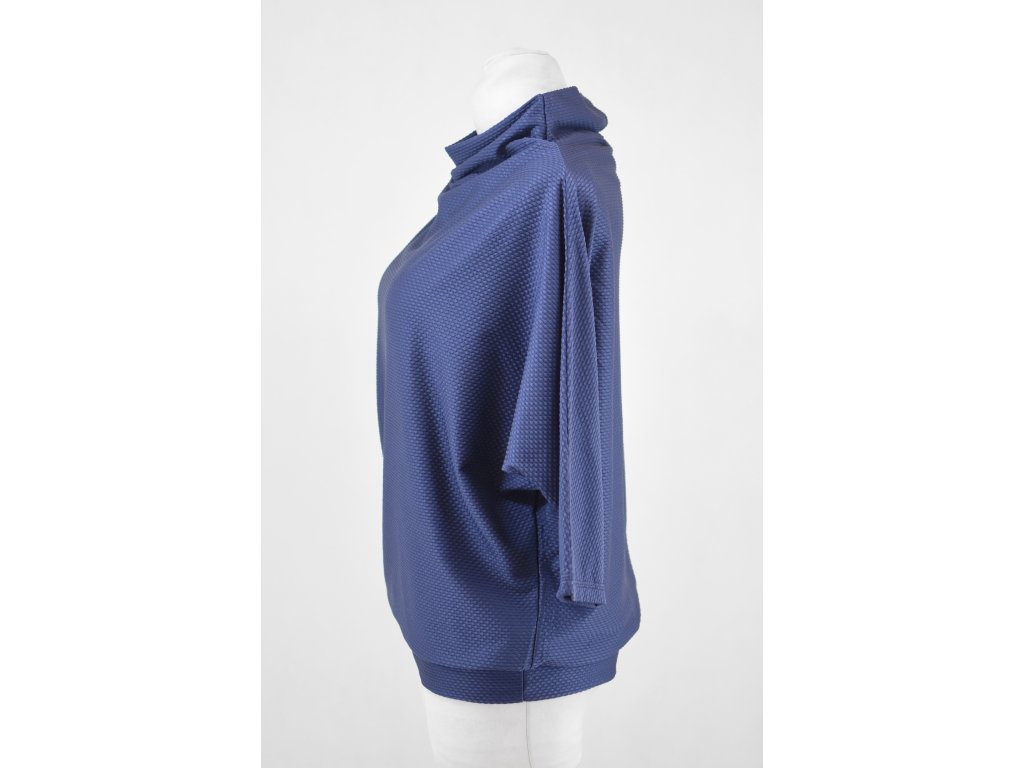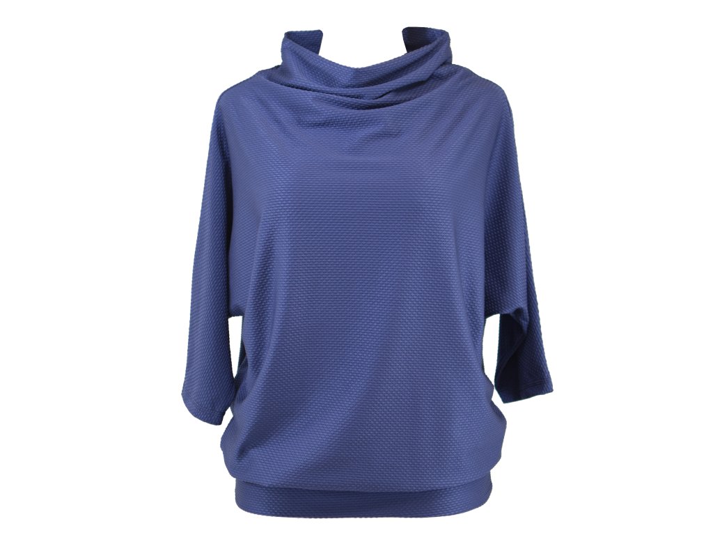 Dámská halenka netopýřího střihu s volnějším dvojitým stojáčkem. Rukávy jsou netopýřího střihu, 3/4 délky. Je s volným hrudníkem a je podkasaná do dvojitého lemu v dolním okraji. Působí volně a ležérně.