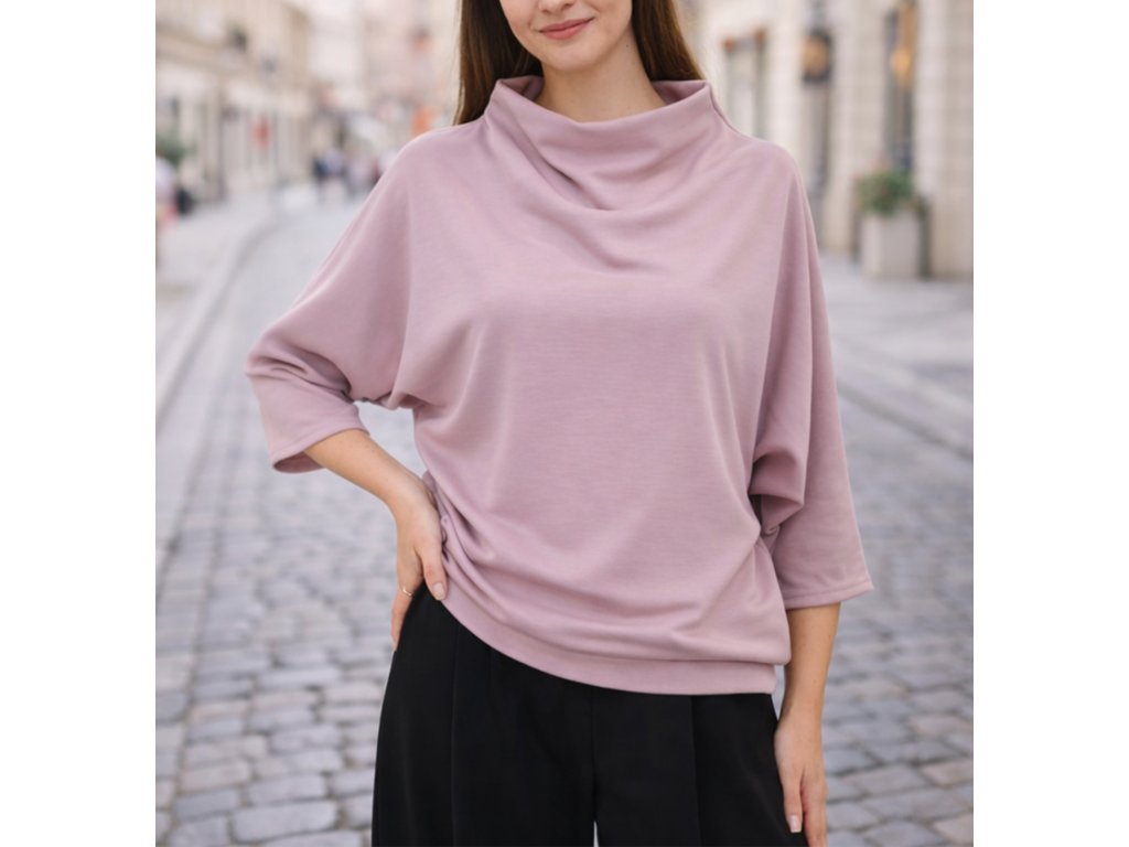 Dámská halenka netopýřího střihu s volnějším dvojitým stojáčkem. Rukávy jsou netopýřího střihu, 3/4 délky. Je s volným hrudníkem a je podkasaná do dvojitého lemu v dolním okraji. Působí volně a ležérně. Díky silnějšímu materiálu se hodí spíše jako svrchní vrstva, zároveň ji však můžete nosit i samostatně jako tričko.