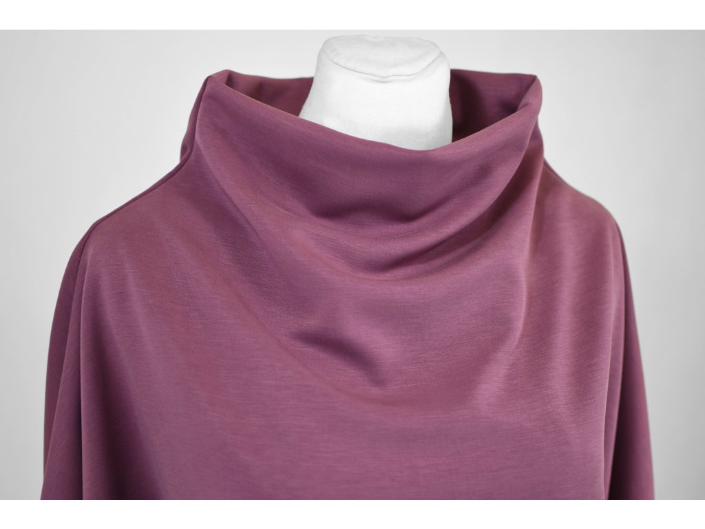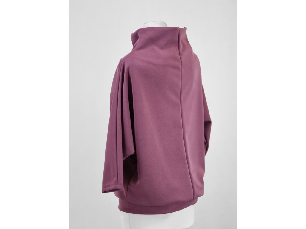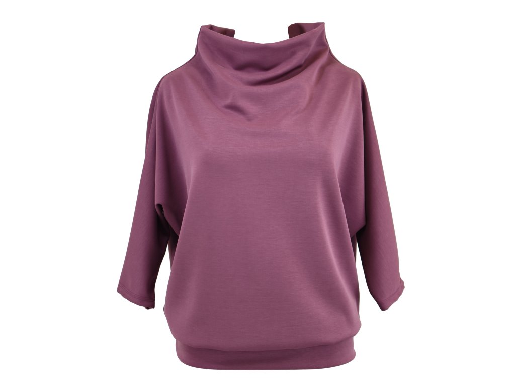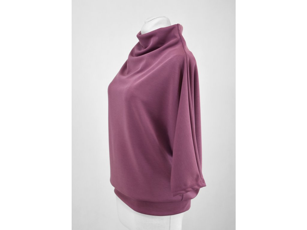 Dámská halenka netopýřího střihu s volnějším dvojitým stojáčkem. Rukávy jsou netopýřího střihu, 3/4 délky. Je s volným hrudníkem a je podkasaná do dvojitého lemu v dolním okraji. Působí volně a ležérně. Díky silnějšímu materiálu se hodí spíše jako svrchní vrstva, zároveň ji však můžete nosit i samostatně jako tričko.