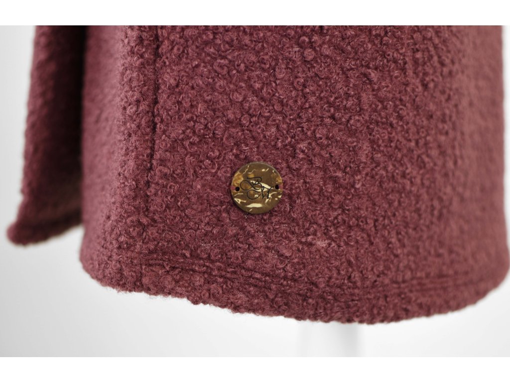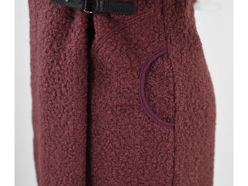 Dámský kabátek rovnějšího střihu se zapínám v pase na levé straně. Zapínání má 2 dírky. Přední díl má dvojité klopy, které postupně přechází do kapuce. Můžete jej nosit více uzavřený, anebo otevřený. Není vypodšívkovaný. Samozřejmostí jsou kapsy v bocích, olemované úpletem. Je myšlený jako slabší verze kabátku nebo jako spodní vrstva v mrazech.