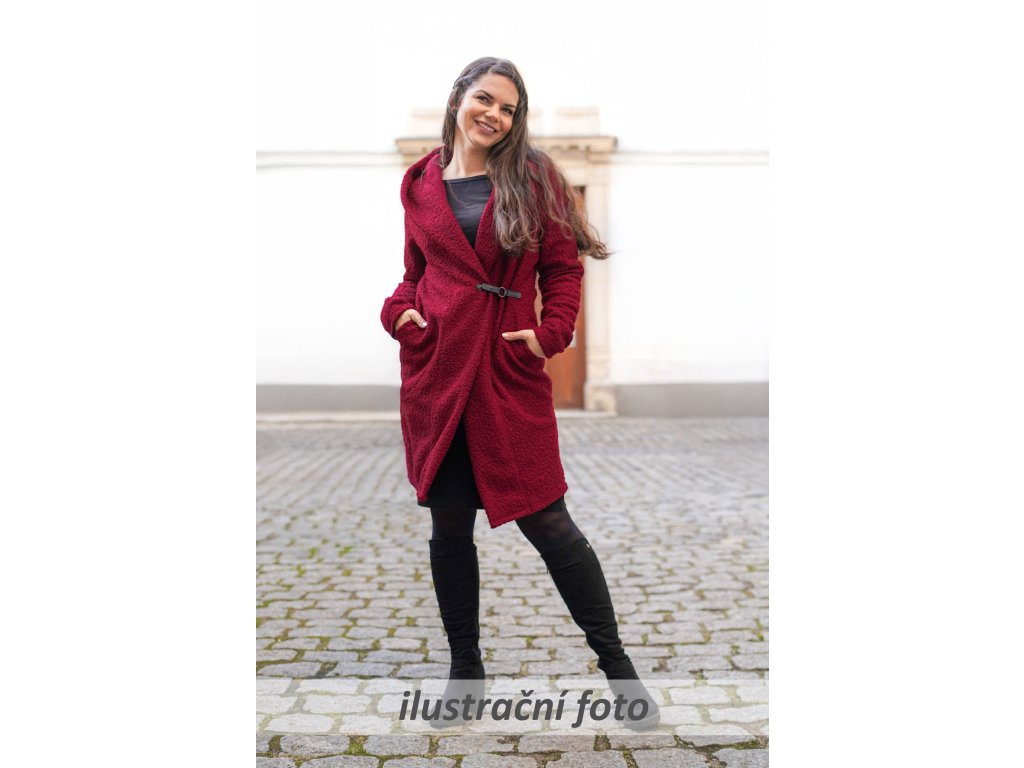 Dámský kabátek rovnějšího střihu se zapínám v pase na levé straně. Zapínání má 2 dírky. Přední díl má dvojité klopy, které postupně přechází do kapuce. Můžete jej nosit více uzavřený, anebo otevřený. Není vypodšívkovaný. Samozřejmostí jsou kapsy v bocích, olemované úpletem. Je myšlený jako slabší verze kabátku nebo jako spodní vrstva v mrazech.