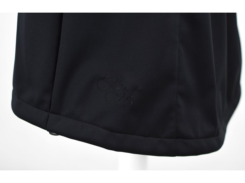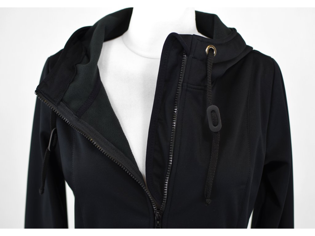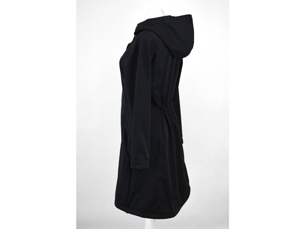 Dámský softshellový kabát áčkového střihu ve slabší elastické verzi. Střih je projmutý do pasu, zadní díl je stažený do pevně všité gumy. V horní části je úzký, postupně se rozšiřuje. V dolním okraji se dá stáhnout gumičkou na obou stranách. Zadní délka je delší než přední část. Kabátek má oboucestný zip, kapsy na zip - všité na předním díle.