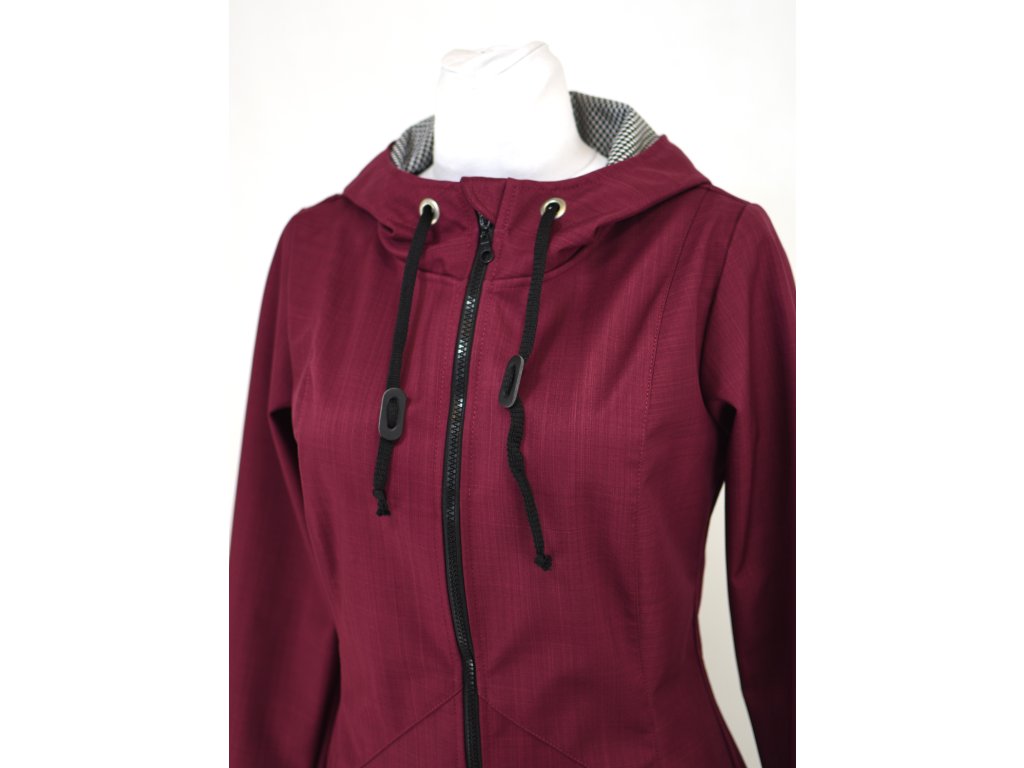 Dámský softshellový kabát áčkového střihu. Střih je projmutý do pasu, zadní díl je stažený do pevně všité gumy. V horní části je úzký, postupně se rozšiřuje. V dolním okraji se dá stáhnout gumičkou na obou stranách. Zadní délka je delší než přední část. Kabátek má oboucestný zip, kapsy na zip - všité na předním díle.