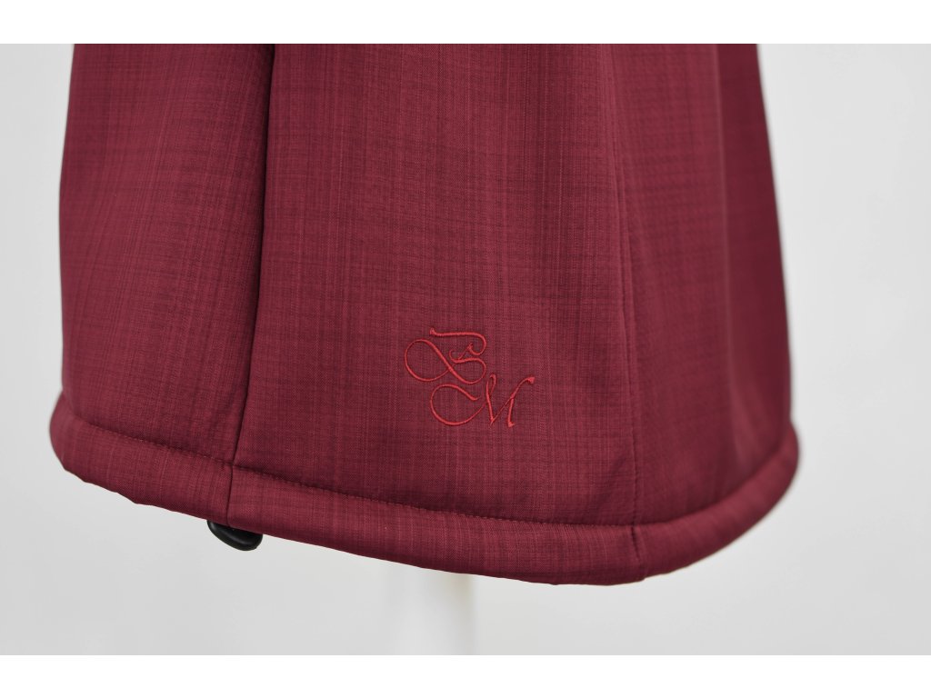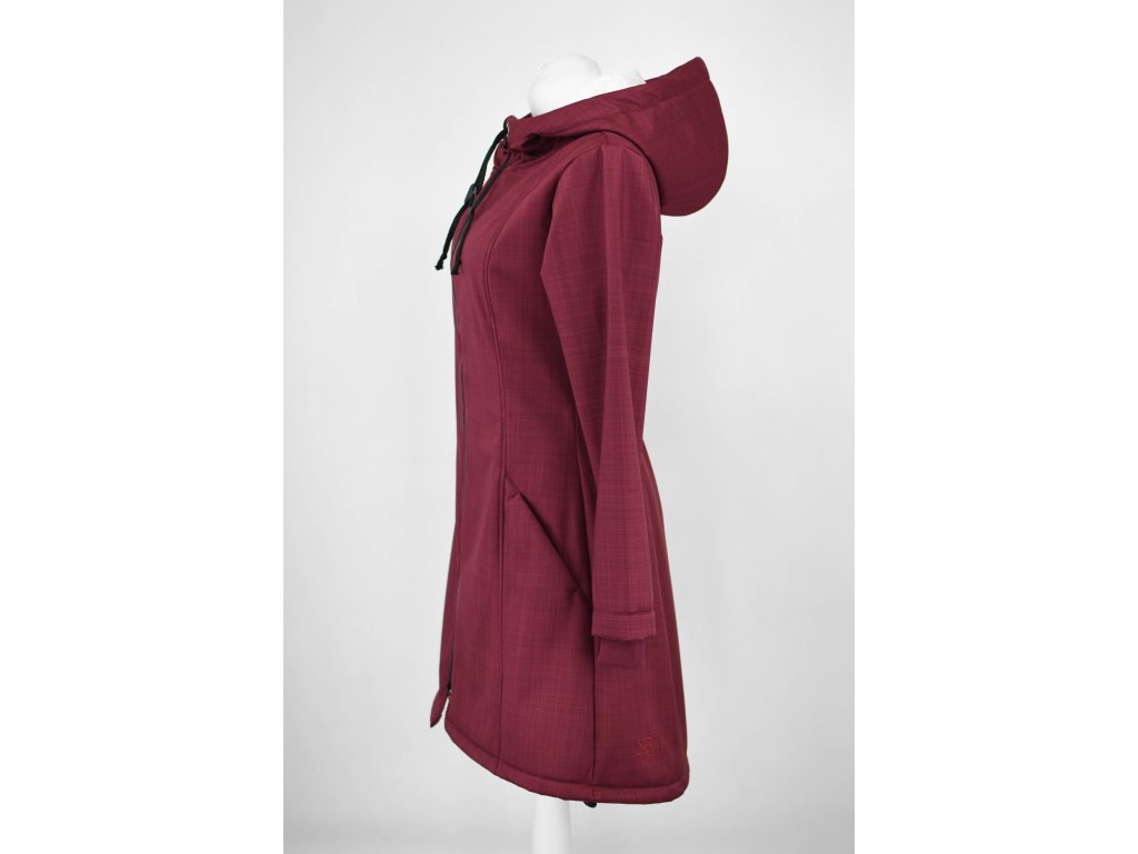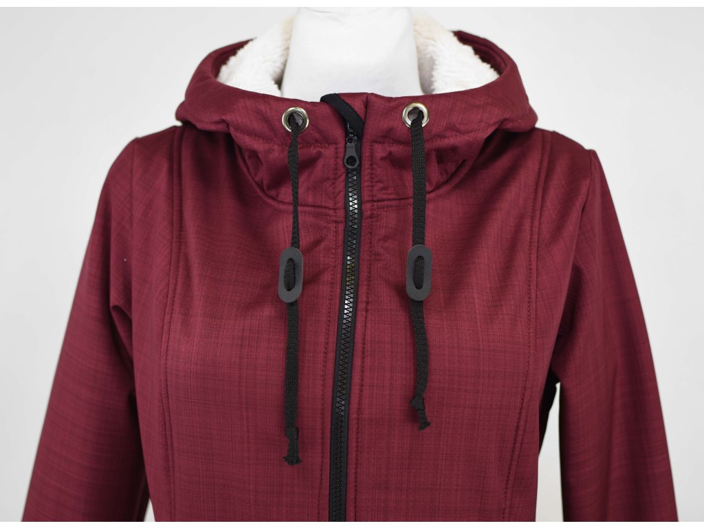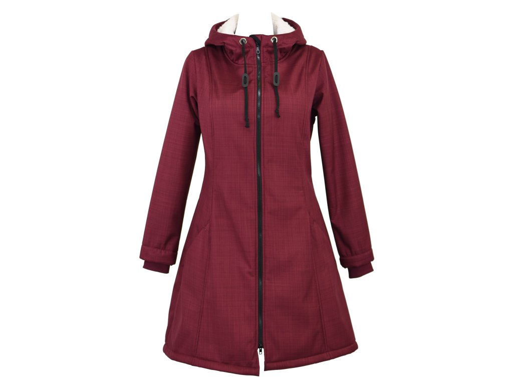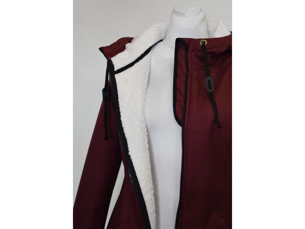 Dámský softshellový kabát áčkového střihu. Střih je projmutý do pasu, zadní díl je stažený do pevně všité gumy. V horní části je úzký, postupně se rozšiřuje. V dolním okraji se dá stáhnout gumičkou na obou stranách. Zadní délka je delší než přední část. Kabátek má oboucestný zip, kapsy na zip - všité na předním díle. Kompletně zateplený měkkým beránkem (včetně kapuce).