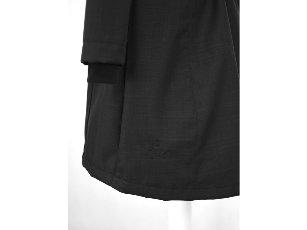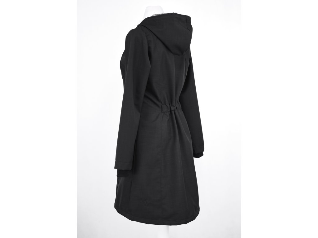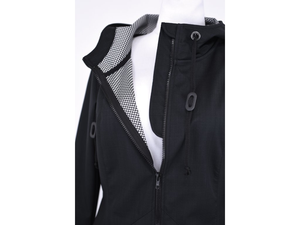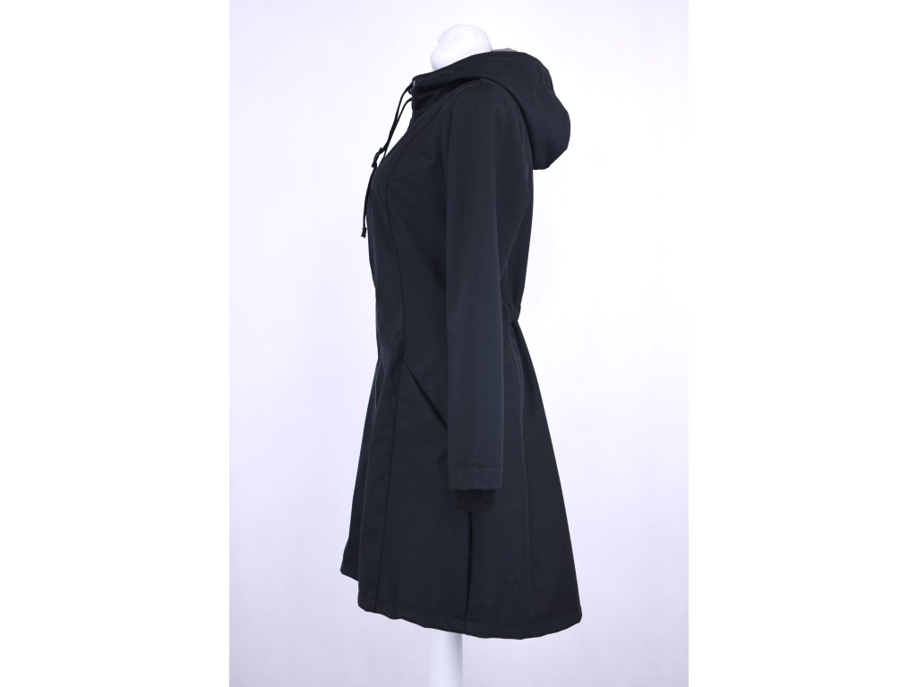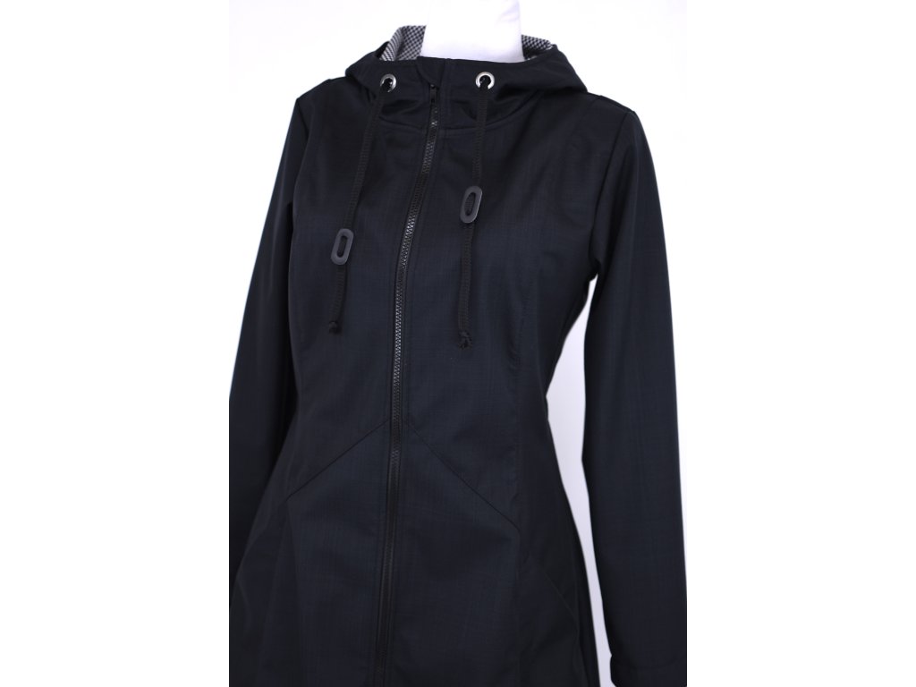 Dámský softshellový kabát áčkového střihu. Střih je projmutý do pasu, zadní díl je stažený do pevně všité gumy. V horní části je úzký, postupně se rozšiřuje. V dolním okraji se dá stáhnout gumičkou na obou stranách. Zadní délka je delší než přední část. Kabátek má oboucestný zip, kapsy na zip - všité na předním díle.
