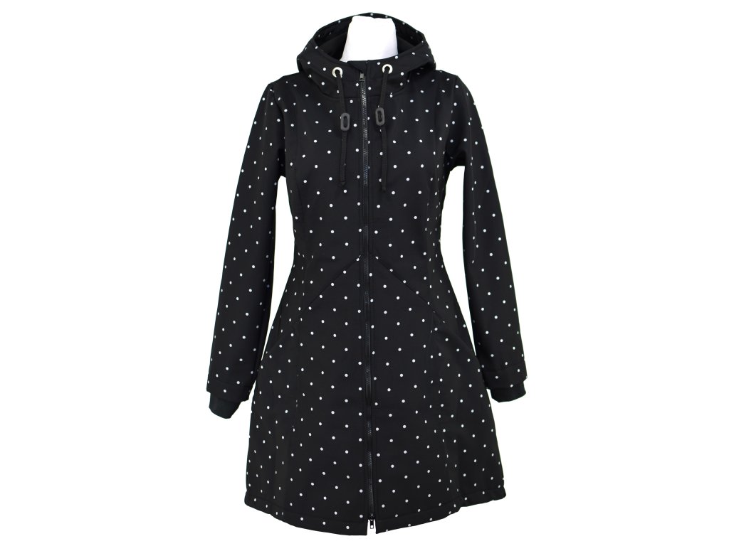 Dámský softshellový kabát áčkového střihu. Střih je projmutý do pasu, zadní díl je stažený do pevně všité gumy. V horní části je úzký, postupně se rozšiřuje. V dolním okraji se dá stáhnout gumičkou na obou stranách. Zadní délka je delší než přední část. Kabátek má oboucestný zip, kapsy na zip - všité na předním díle.