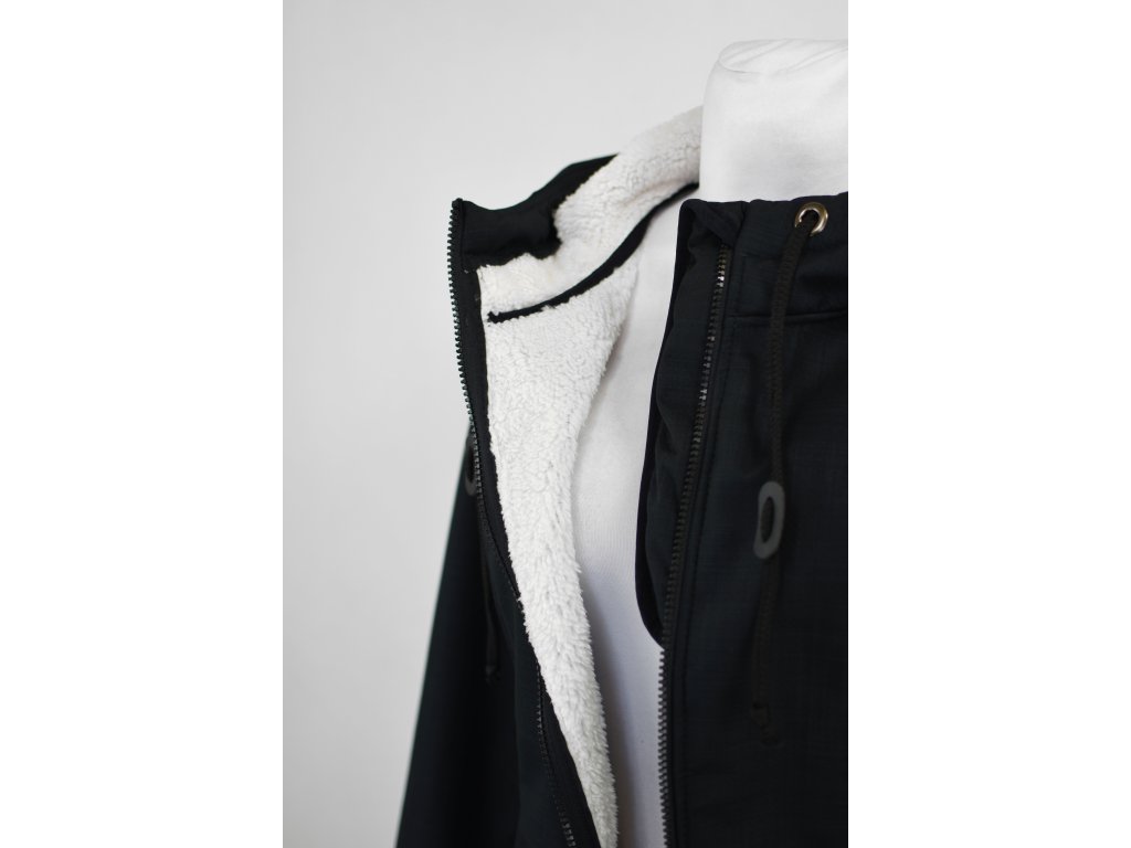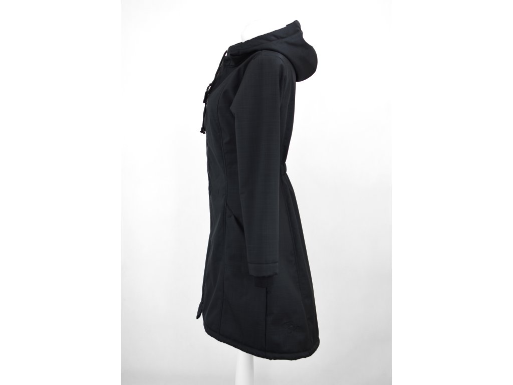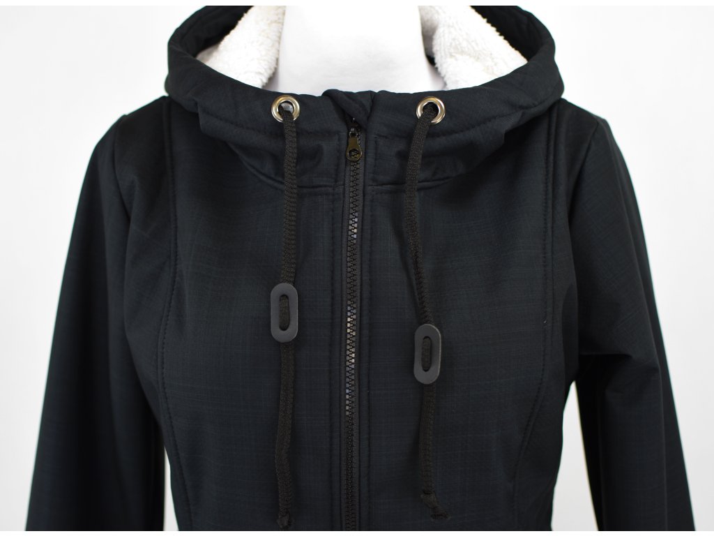 Dámský softshellový kabát áčkového střihu. Střih je projmutý do pasu, zadní díl je stažený do pevně všité gumy. V horní části je úzký, postupně se rozšiřuje. V dolním okraji se dá stáhnout gumičkou na obou stranách. Zadní délka je delší než přední část. Kabátek má oboucestný zip, kapsy na zip - všité na předním díle. Kompletně zateplený měkkým beránkem (včetně kapuce).