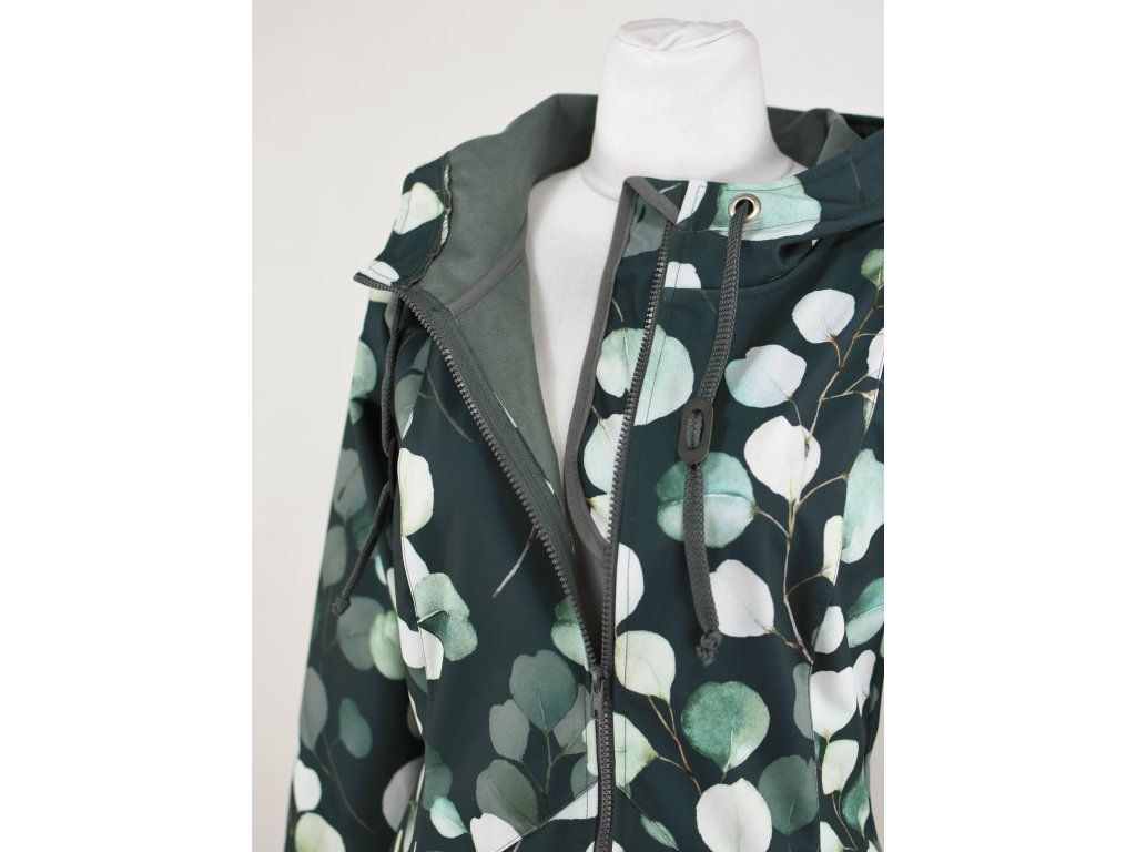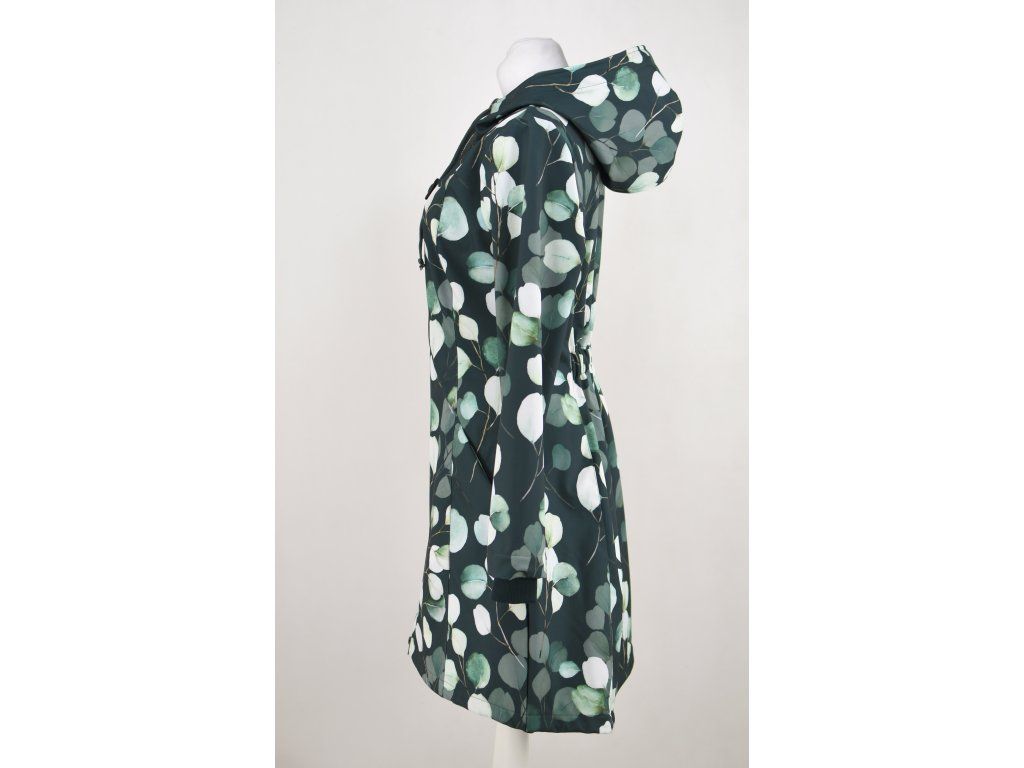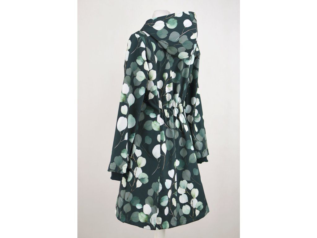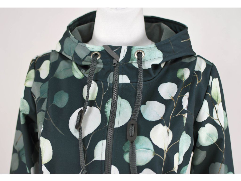Dámský softshellový kabát áčkového střihu. Střih je projmutý do pasu, zadní díl je stažený do pevně všité gumy. V horní části je úzký, postupně se rozšiřuje. V dolním okraji se dá stáhnout gumičkou na obou stranách. Zadní délka je delší než přední část. Kabátek má oboucestný zip, kapsy na zip - všité na předním díle. Kabát je bez podšívky, z rubu je slabší fleece.