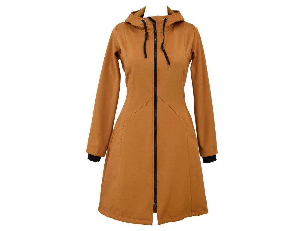 Dámský softshellový kabát áčkového střihu. Střih je projmutý do pasu, zadní díl je stažený do pevně všité gumy. V horní části je úzký, postupně se rozšiřuje. V dolním okraji se dá stáhnout gumičkou na obou stranách. Zadní délka je delší než přední část. Kabátek má oboucestný zip, kapsy na zip - všité na předním díle.
