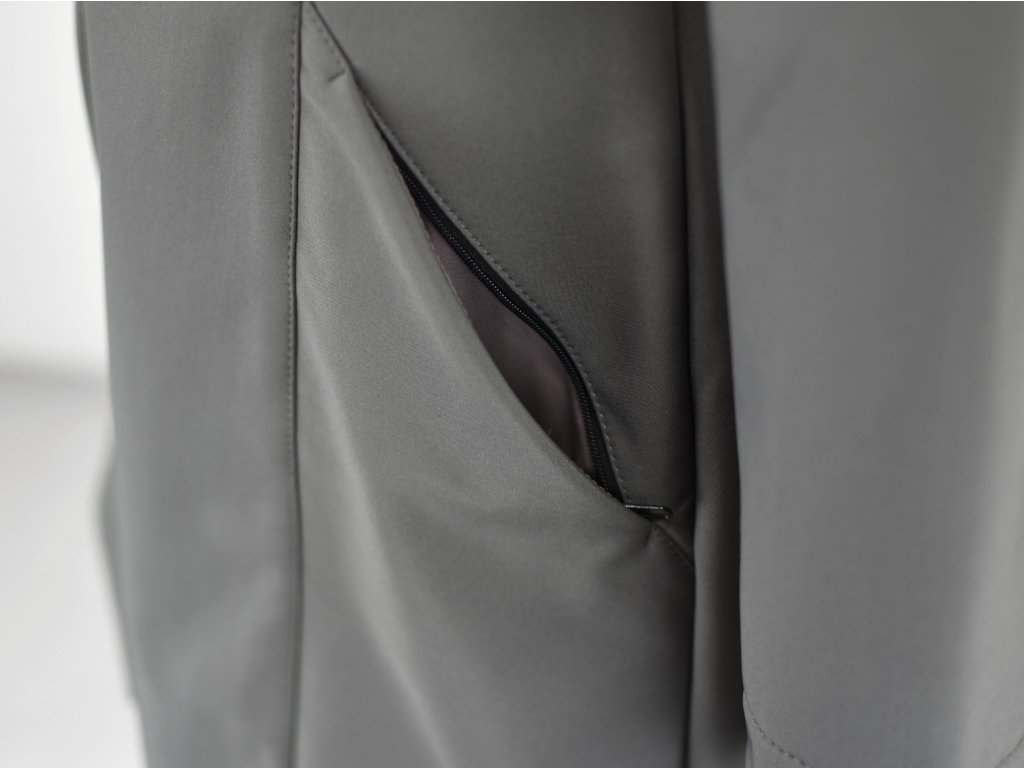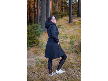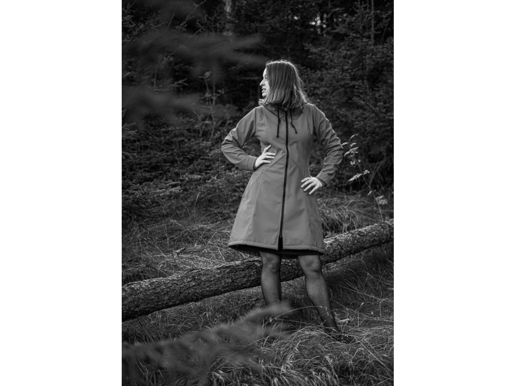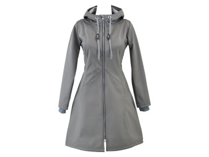 Dámský softshellový kabát áčkového střihu. Střih je projmutý do pasu, zadní díl je stažený do pevně všité gumy. V horní části je úzký, postupně se rozšiřuje. V dolním okraji se dá stáhnout gumičkou na obou stranách. Zadní délka je delší než přední část. Kabátek má oboucestný zip, kapsy na zip - všité na předním díle.