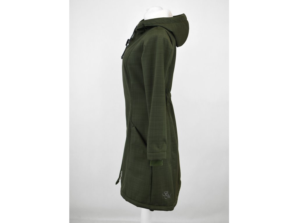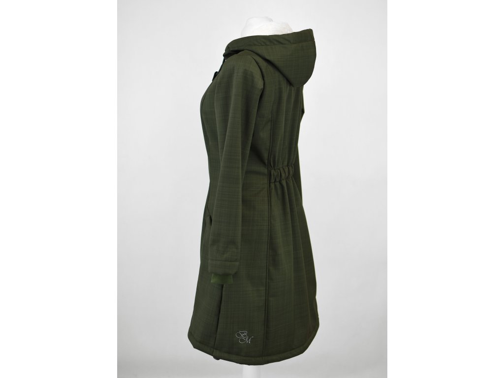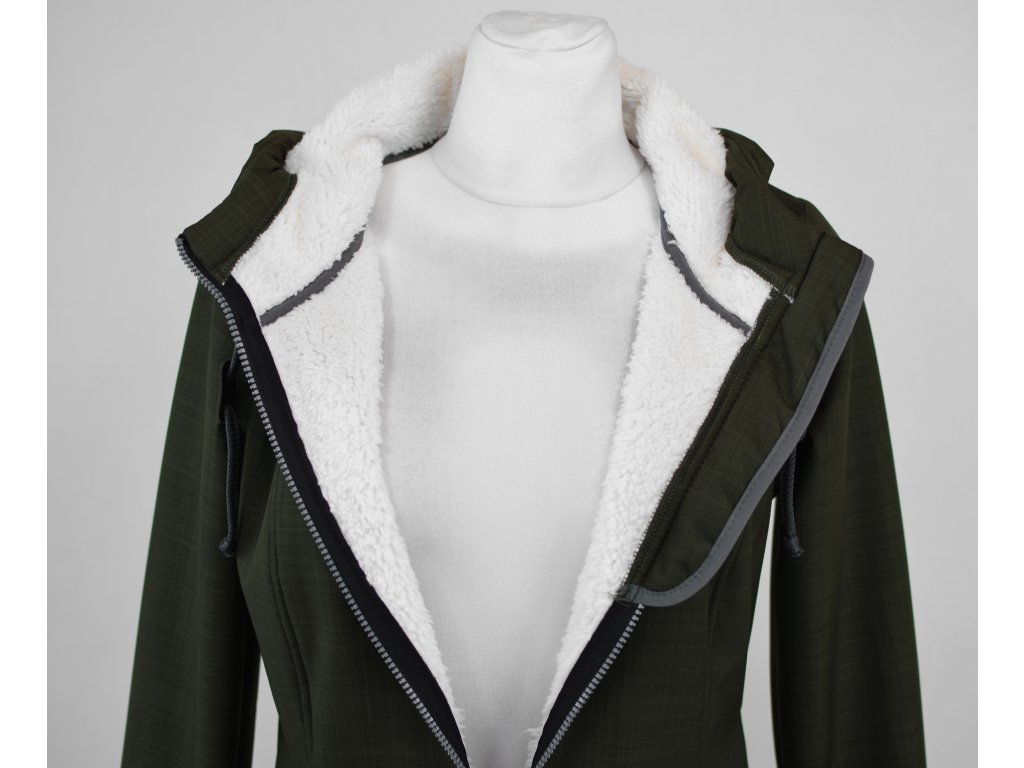 Dámský softshellový kabát áčkového střihu. Střih je projmutý do pasu, zadní díl je stažený do pevně všité gumy. V horní části je úzký, postupně se rozšiřuje. V dolním okraji se dá stáhnout gumičkou na obou stranách. Zadní délka je delší než přední část. Kabátek má oboucestný zip, kapsy na zip - všité na předním díle. Kompletně zateplený měkkým beránkem (včetně kapuce).