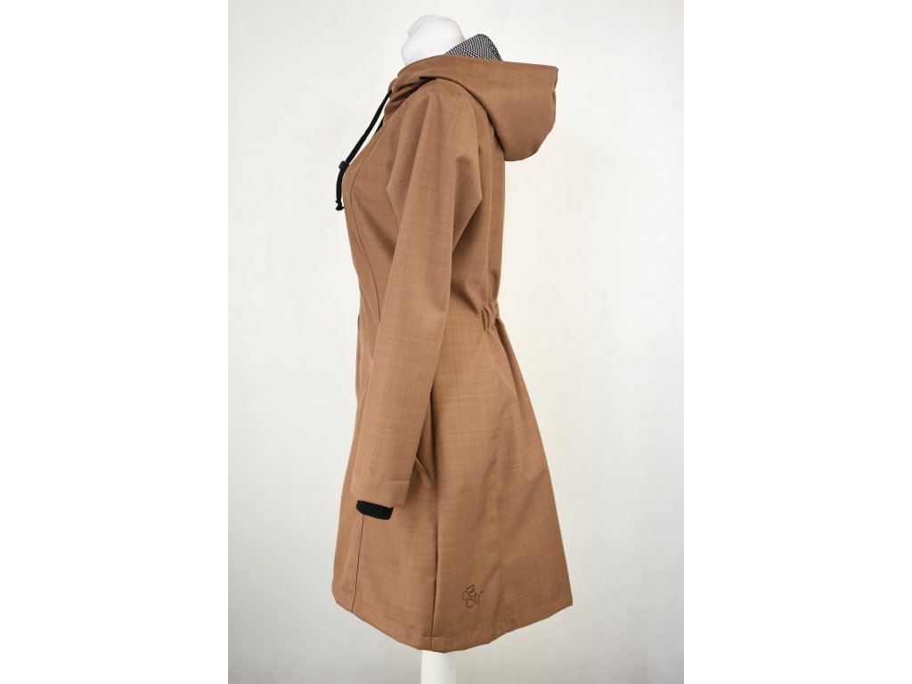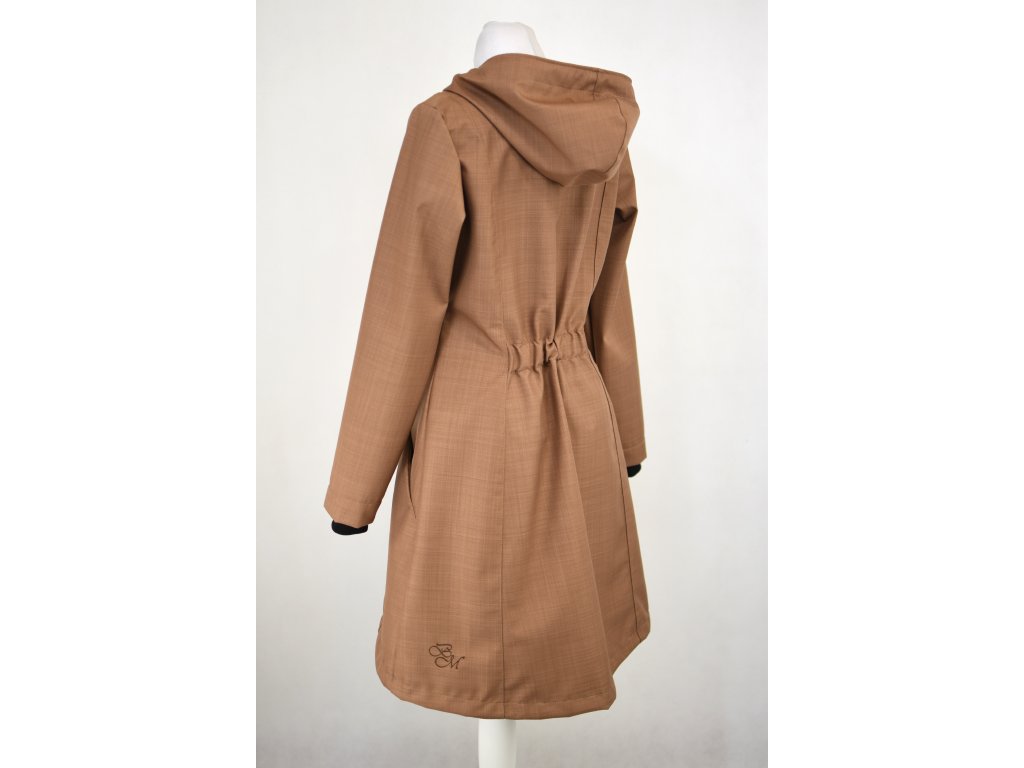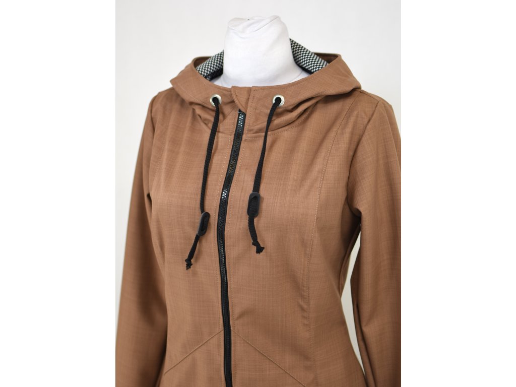 Dámský softshellový kabát áčkového střihu. Střih je projmutý do pasu, zadní díl je stažený do pevně všité gumy. V horní části je úzký, postupně se rozšiřuje. V dolním okraji se dá stáhnout gumičkou na obou stranách. Zadní délka je delší než přední část. Kabátek má oboucestný zip, kapsy na zip - všité na předním díle.