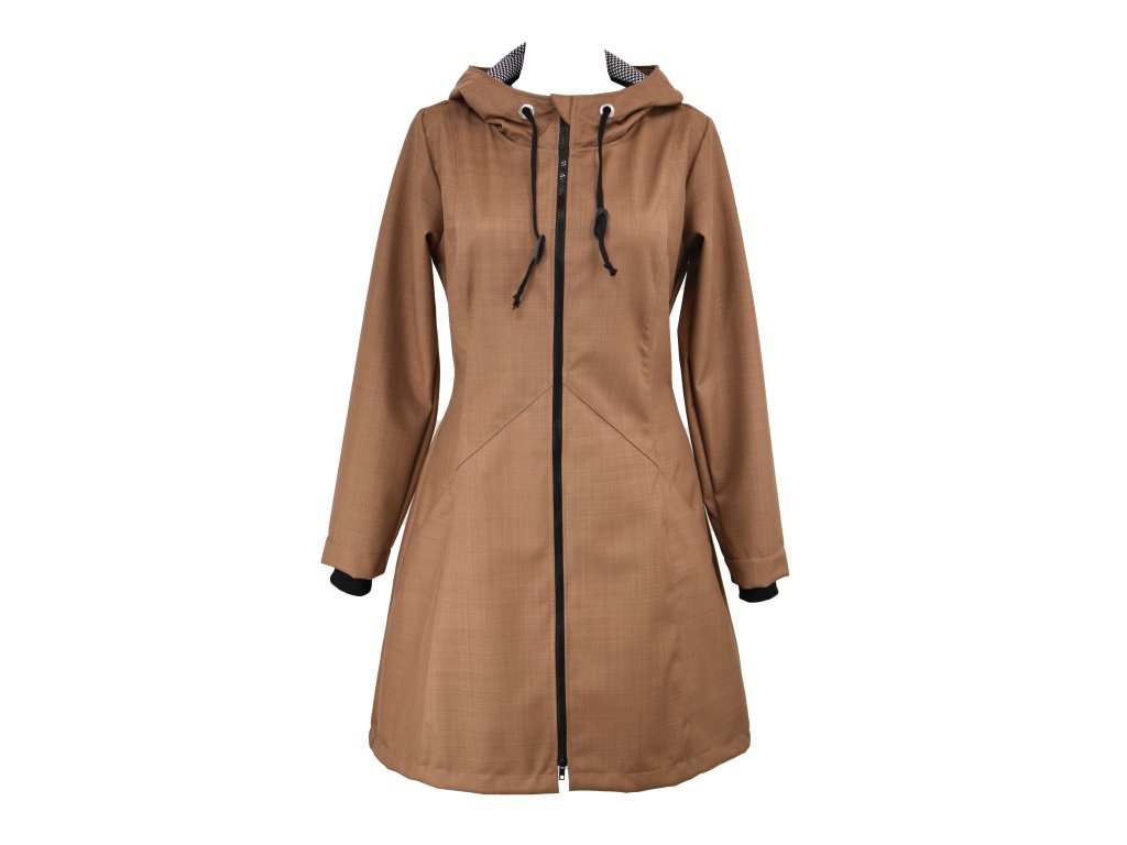 Dámský softshellový kabát áčkového střihu. Střih je projmutý do pasu, zadní díl je stažený do pevně všité gumy. V horní části je úzký, postupně se rozšiřuje. V dolním okraji se dá stáhnout gumičkou na obou stranách. Zadní délka je delší než přední část. Kabátek má oboucestný zip, kapsy na zip - všité na předním díle.