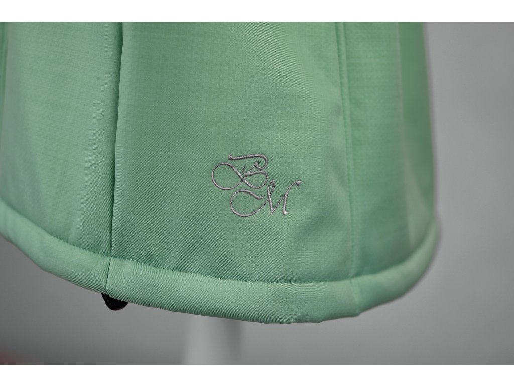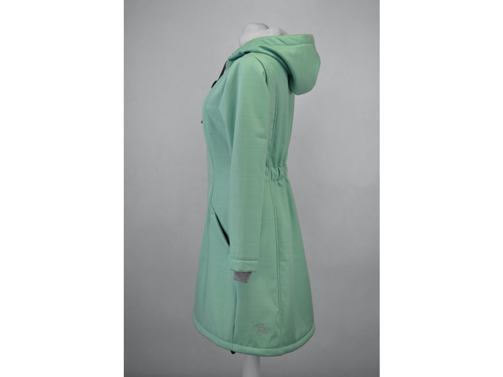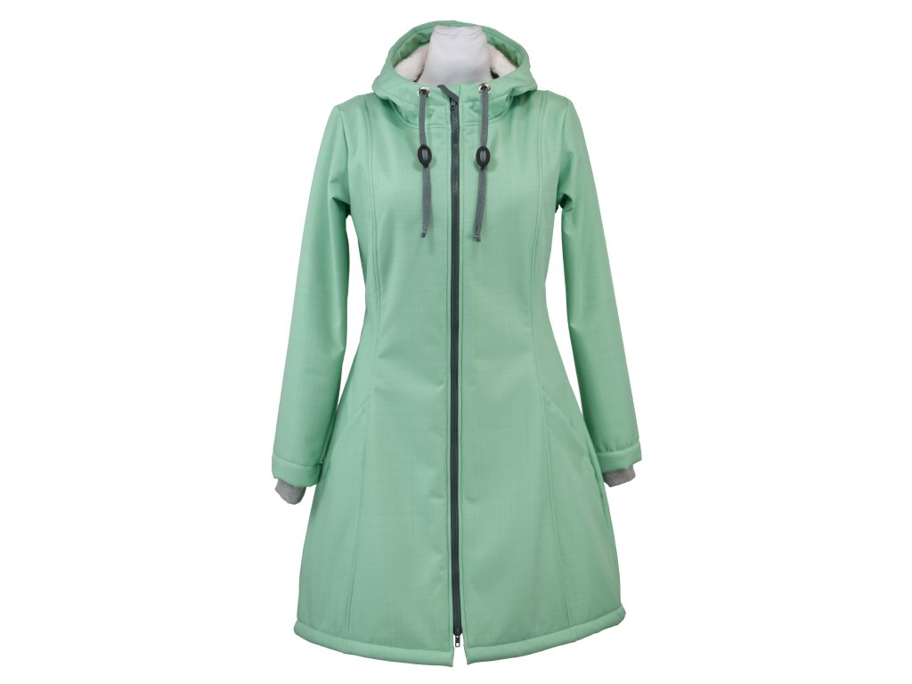 Dámský softshellový kabát áčkového střihu. Střih je projmutý do pasu, zadní díl je stažený do pevně všité gumy. V horní části je úzký, postupně se rozšiřuje. V dolním okraji se dá stáhnout gumičkou na obou stranách. Zadní délka je delší než přední část. Kabátek má oboucestný zip, kapsy na zip - všité na předním díle. Kompletně zateplený měkkým beránkem (včetně kapuce).