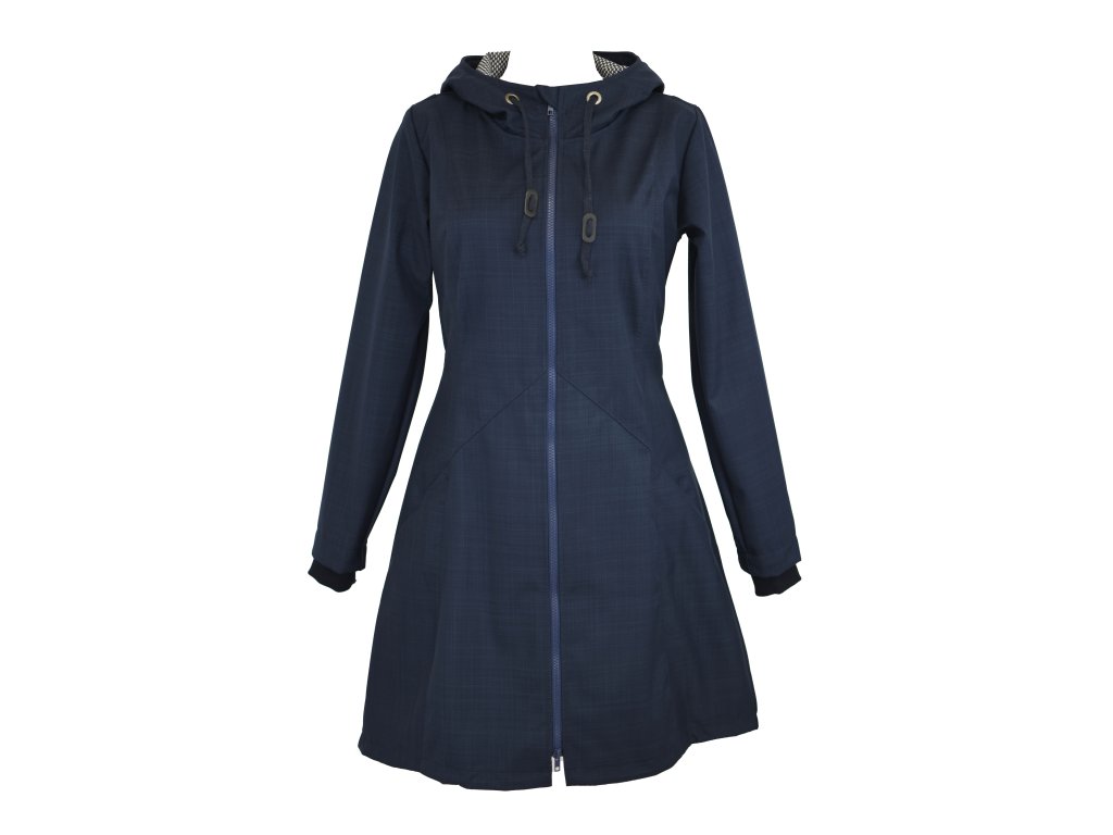 Dámský softshellový kabát áčkového střihu. Střih je projmutý do pasu, zadní díl je stažený do pevně všité gumy. V horní části je úzký, postupně se rozšiřuje. V dolním okraji se dá stáhnout gumičkou na obou stranách. Zadní délka je delší než přední část. Kabátek má oboucestný zip, kapsy na zip - všité na předním díle.