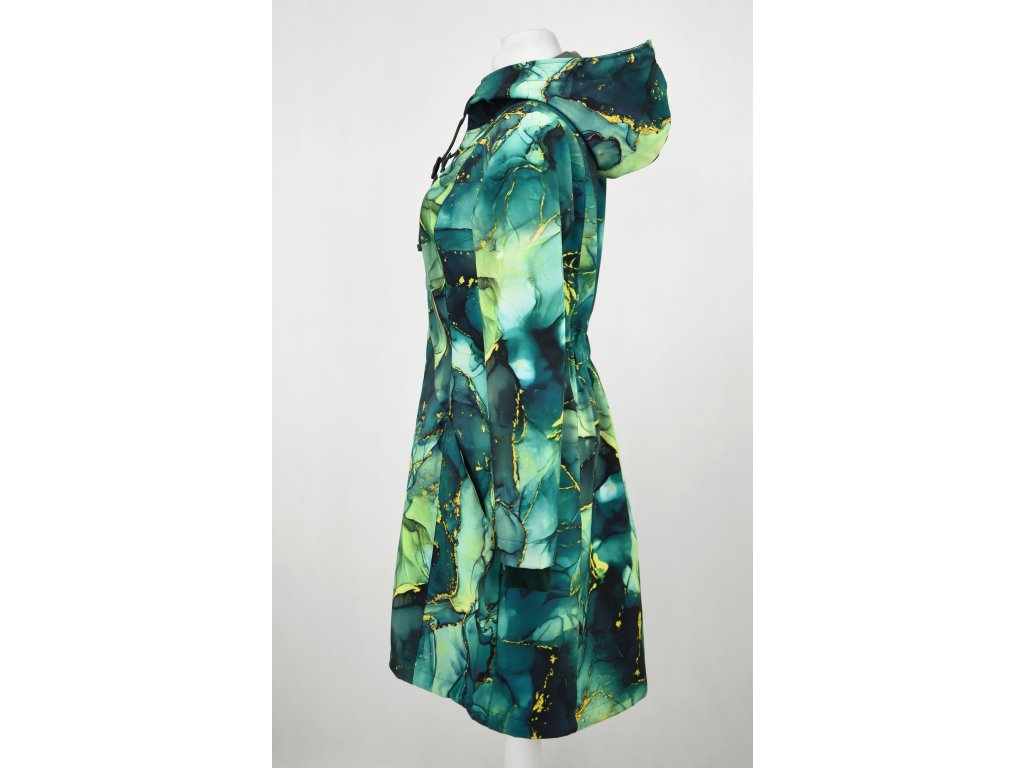 Dámský softshellový kabát áčkového střihu. Střih je projmutý do pasu, zadní díl je stažený do pevně všité gumy. V horní části je úzký, postupně se rozšiřuje. V dolním okraji se dá stáhnout gumičkou na obou stranách. Zadní délka je delší než přední část. Kabátek má oboucestný zip, kapsy na zip - všité na předním díle. Kabát je bez podšívky, z rubu je slabší fleece.