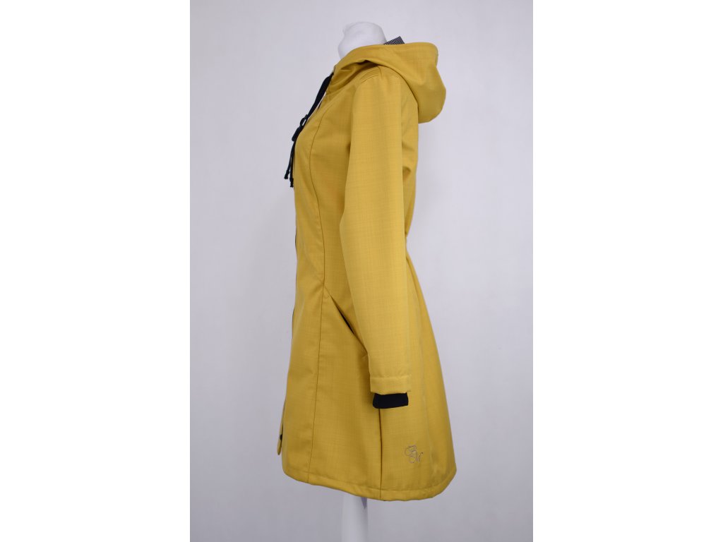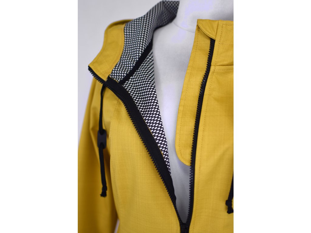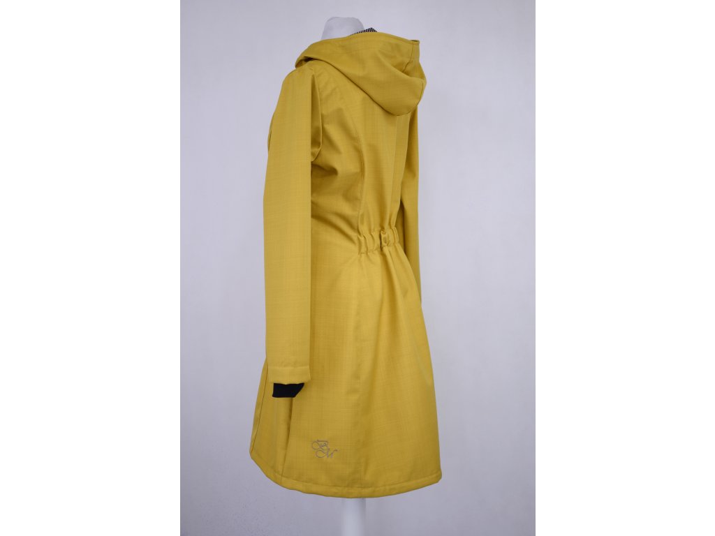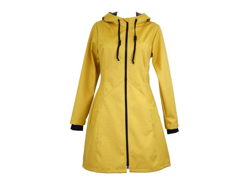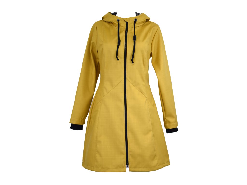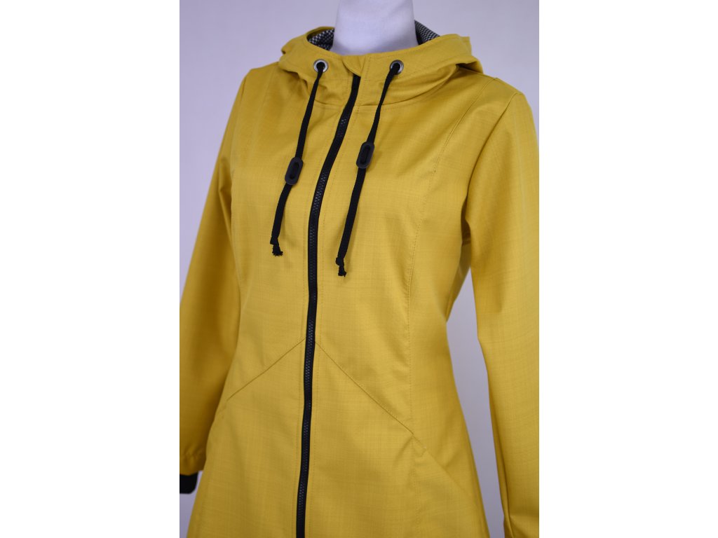 Dámský softshellový kabát áčkového střihu. Střih je projmutý do pasu, zadní díl je stažený do pevně všité gumy. V horní části je úzký, postupně se rozšiřuje. V dolním okraji se dá stáhnout gumičkou na obou stranách. Zadní délka je delší než přední část. Kabátek má oboucestný zip, kapsy na zip - všité na předním díle.