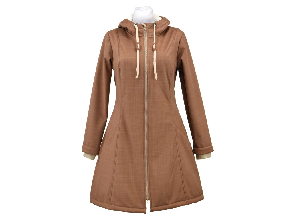 Dámský softshellový kabát áčkového střihu. Střih je projmutý do pasu, zadní díl je stažený do pevně všité gumy. V horní části je úzký, postupně se rozšiřuje. V dolním okraji se dá stáhnout gumičkou na obou stranách. Zadní délka je delší než přední část. Kabátek má oboucestný zip, kapsy na zip - všité na předním díle. Kompletně zateplený měkkým beránkem (včetně kapuce).