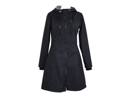 Dámský softshellový kabát áčkového střihu. Střih je projmutý do pasu, zadní díl je stažený do pevně všité gumy. V horní části je úzký, postupně se rozšiřuje. V dolním okraji se dá stáhnout gumičkou na obou stranách. Zadní délka je delší než přední část. Kabátek má oboucestný zip, kapsy na zip - všité na předním díle. Kabát je bez podšívky, z rubu je slabší fleece.