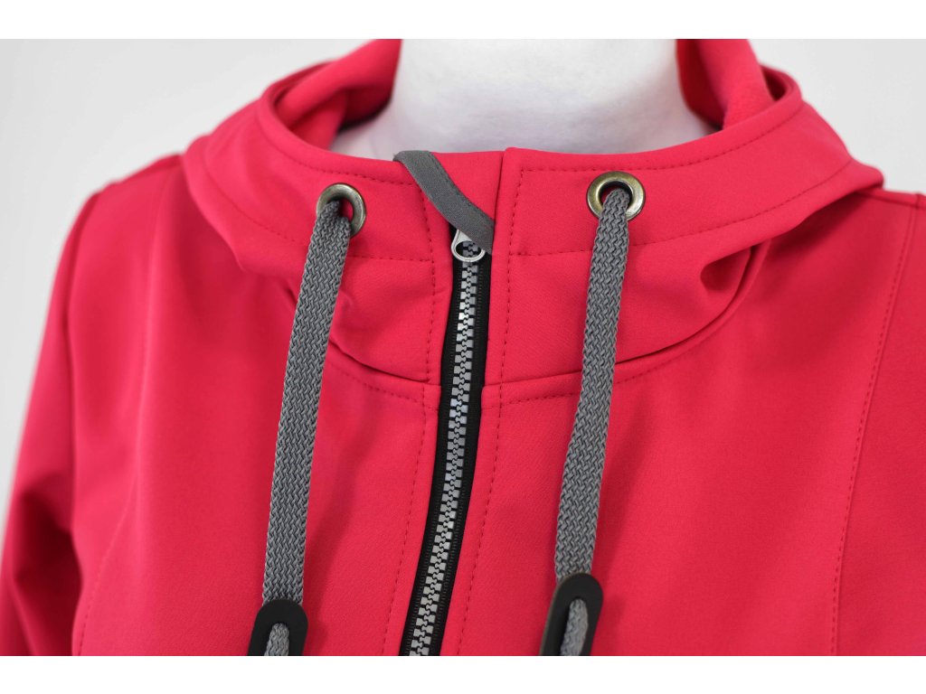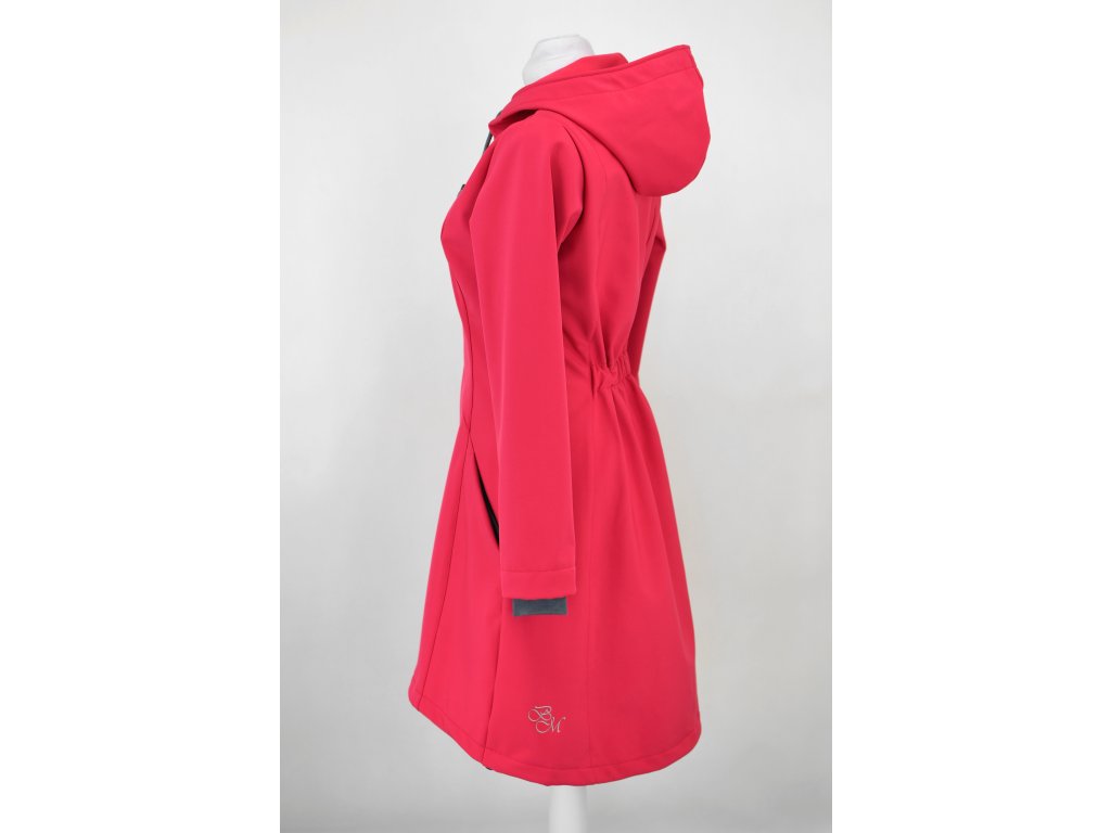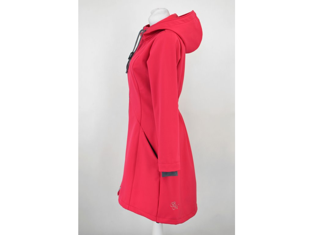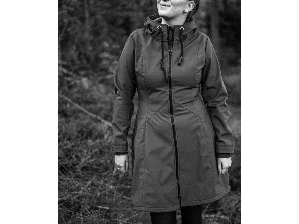 Dámský softshellový kabát áčkového střihu. Střih je projmutý do pasu, zadní díl je stažený do pevně všité gumy. V horní části je úzký, postupně se rozšiřuje. V dolním okraji se dá stáhnout gumičkou na obou stranách. Zadní délka je delší než přední část. Kabátek má oboucestný zip, kapsy na zip - všité na předním díle.