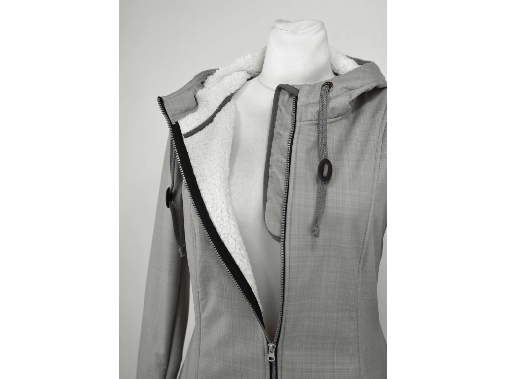 Dámský softshellový kabát áčkového střihu. Střih je projmutý do pasu, zadní díl je stažený do pevně všité gumy. V horní části je úzký, postupně se rozšiřuje. V dolním okraji se dá stáhnout gumičkou na obou stranách. Zadní délka je delší než přední část. Kabátek má oboucestný zip, kapsy na zip - všité na předním díle. Kompletně zateplený měkkým beránkem (včetně kapuce).