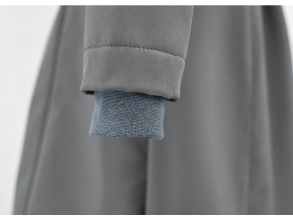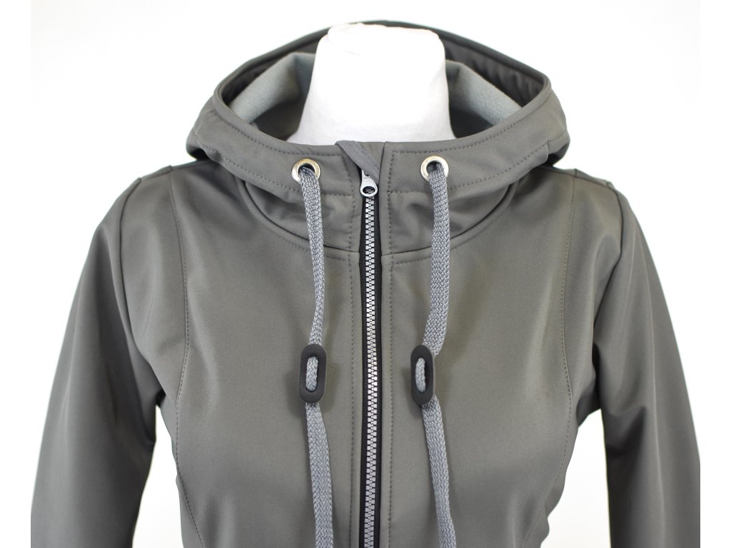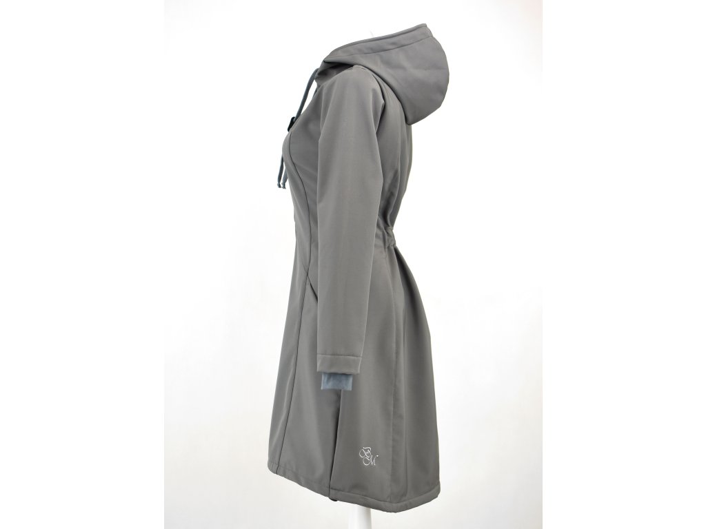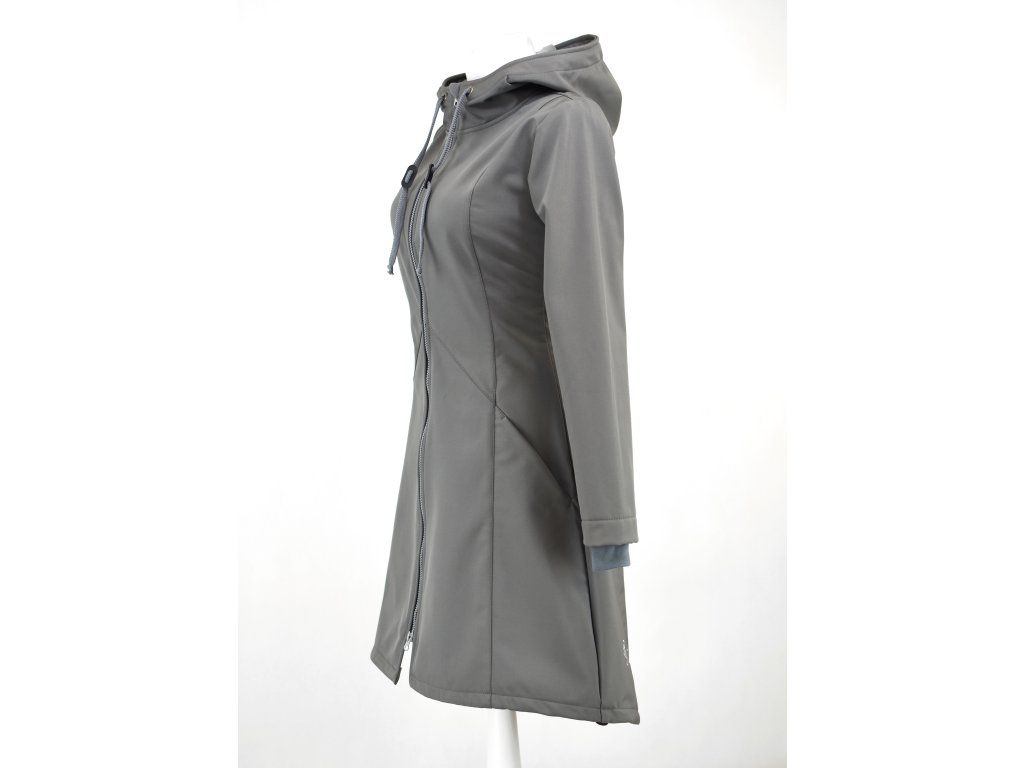 Dámský softshellový kabát áčkového střihu. Střih je projmutý do pasu, zadní díl je stažený do pevně všité gumy. V horní části je úzký, postupně se rozšiřuje. V dolním okraji se dá stáhnout gumičkou na obou stranách. Zadní délka je delší než přední část. Kabátek má oboucestný zip, kapsy na zip - všité na předním díle.
