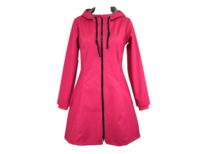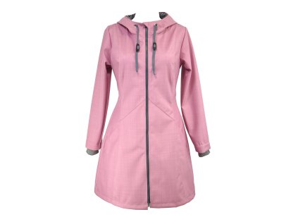 Dámský softshellový kabát áčkového střihu. Střih je projmutý do pasu, zadní díl je stažený do pevně všité gumy. V horní části je úzký, postupně se rozšiřuje. V dolním okraji se dá stáhnout gumičkou na obou stranách. Zadní délka je delší než přední část. Kabátek má oboucestný zip, kapsy na zip - všité na předním díle.