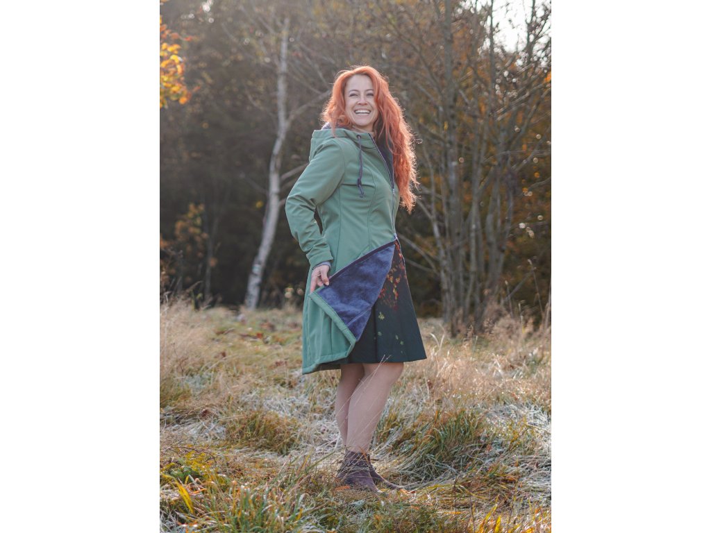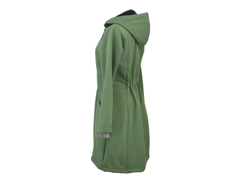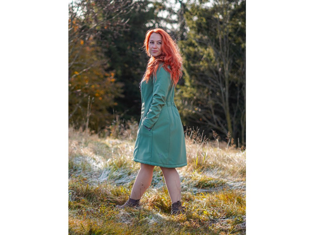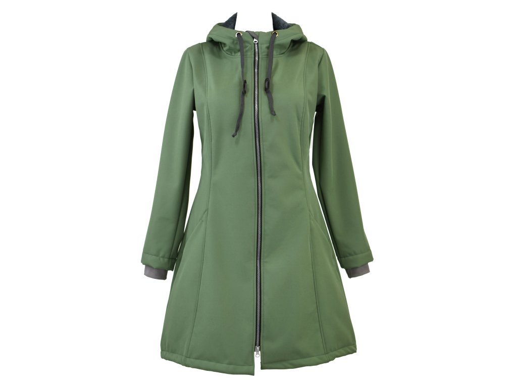 Dámský softshellový kabát áčkového střihu. Střih je projmutý do pasu, zadní díl je stažený do pevně všité gumy. V horní části je úzký, postupně se rozšiřuje. V dolním okraji se dá stáhnout gumičkou na obou stranách. Zadní délka je delší než přední část. Kabátek má oboucestný zip, kapsy na zip - všité na předním díle. Kompletně zateplený měkkým "ňuňu" beránkem (včetně kapuce) - extra jemný měkký chloupek.