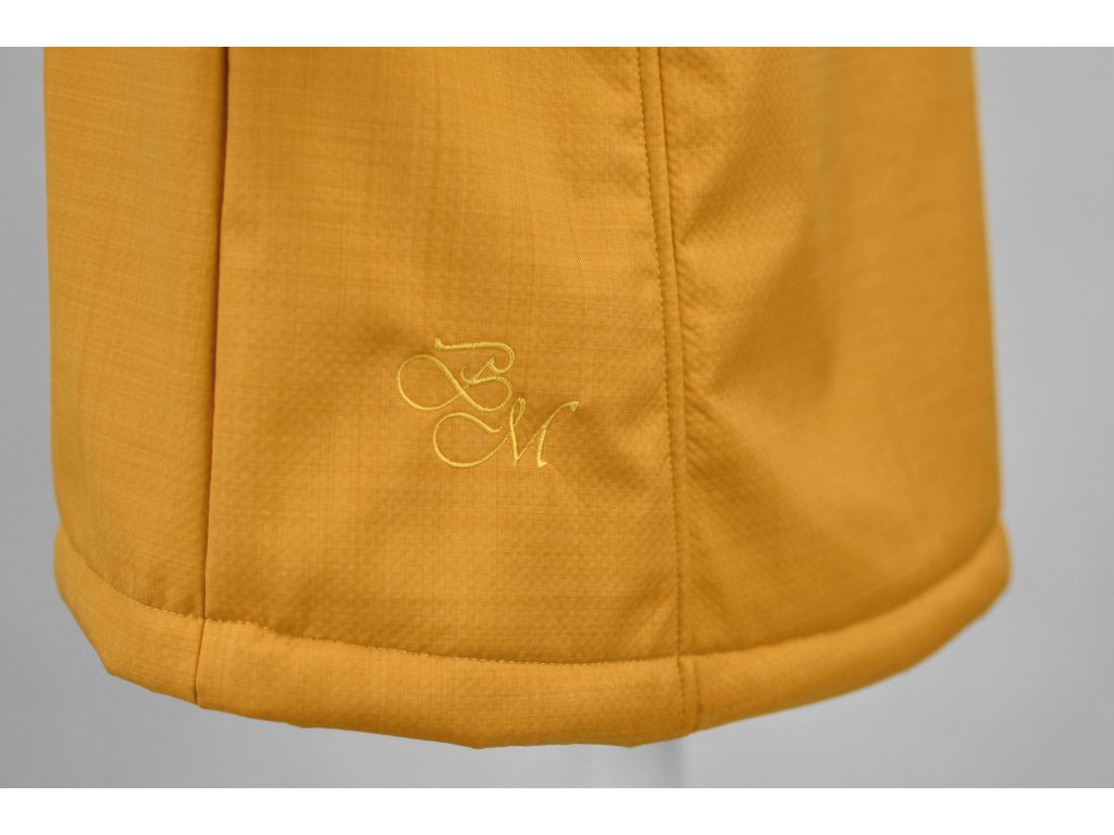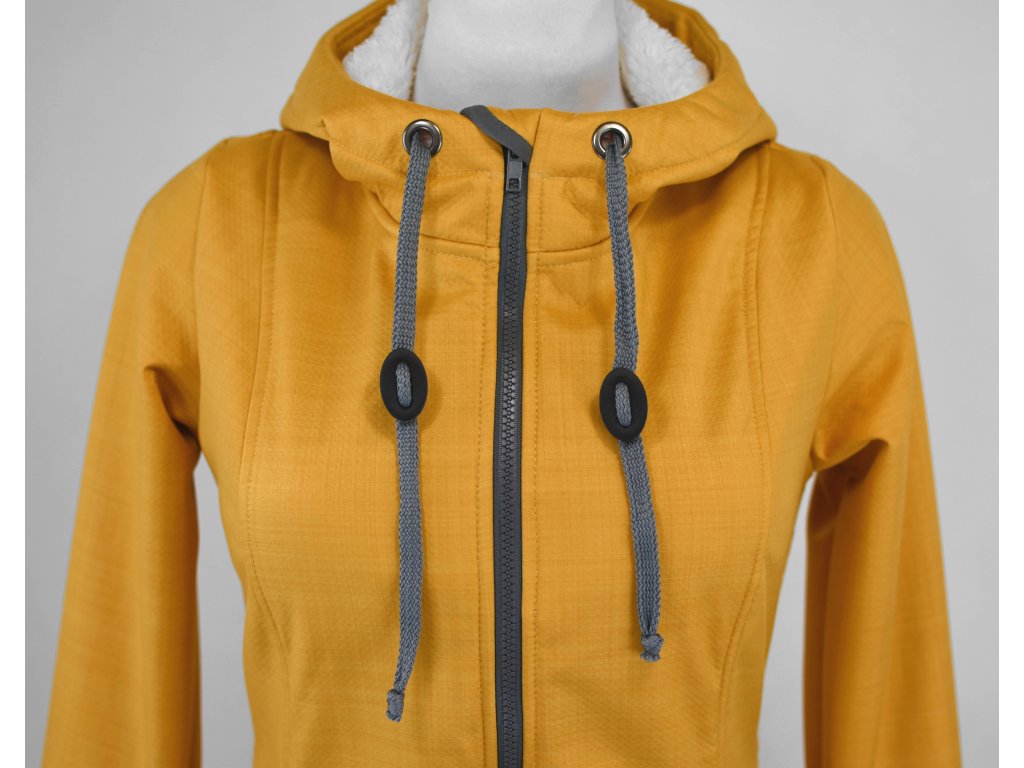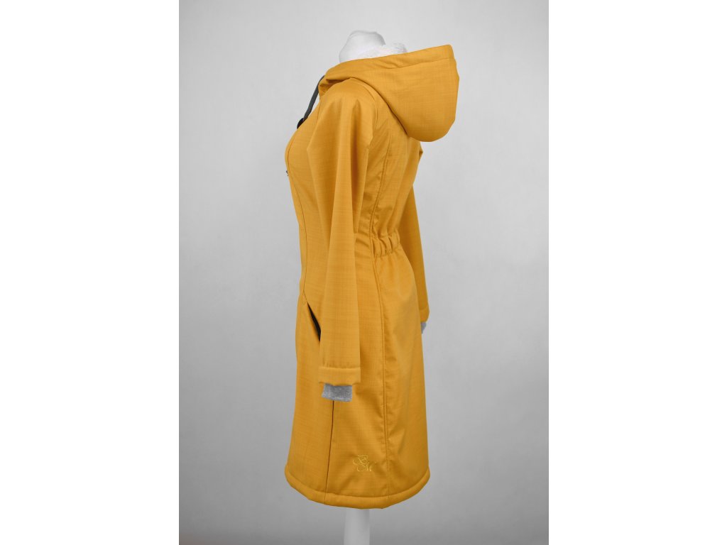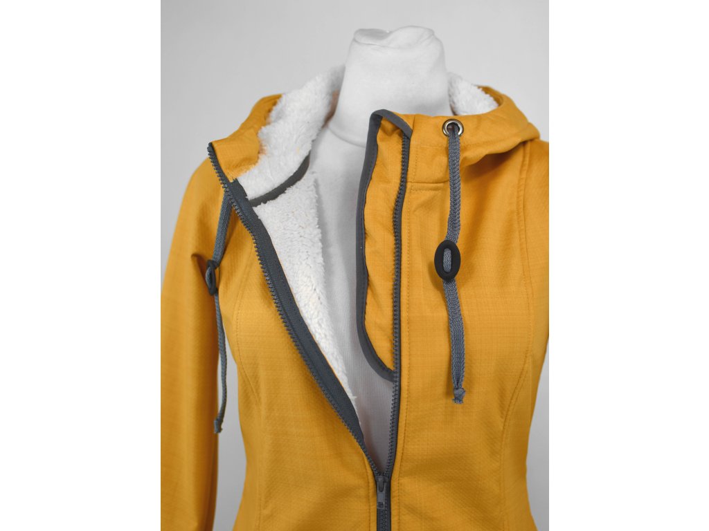 Dámský softshellový kabát áčkového střihu. Střih je projmutý do pasu, zadní díl je stažený do pevně všité gumy. V horní části je úzký, postupně se rozšiřuje. V dolním okraji se dá stáhnout gumičkou na obou stranách. Zadní délka je delší než přední část. Kabátek má oboucestný zip, kapsy na zip - všité na předním díle. Kompletně zateplený měkkým beránkem (včetně kapuce).