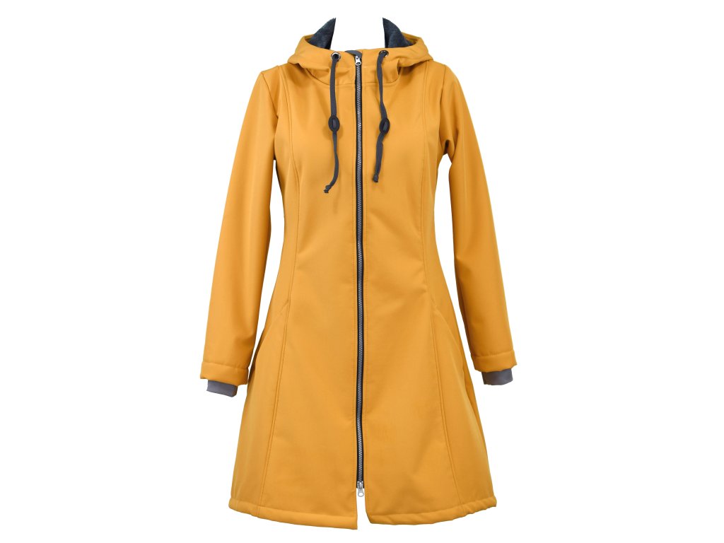 Dámský softshellový kabát áčkového střihu. Střih je projmutý do pasu, zadní díl je stažený do pevně všité gumy. V horní části je úzký, postupně se rozšiřuje. V dolním okraji se dá stáhnout gumičkou na obou stranách. Zadní délka je delší než přední část. Kabátek má oboucestný zip, kapsy na zip - všité na předním díle. Kompletně zateplený měkkým "ňuňu" beránkem (včetně kapuce) - extra jemný měkký chloupek.