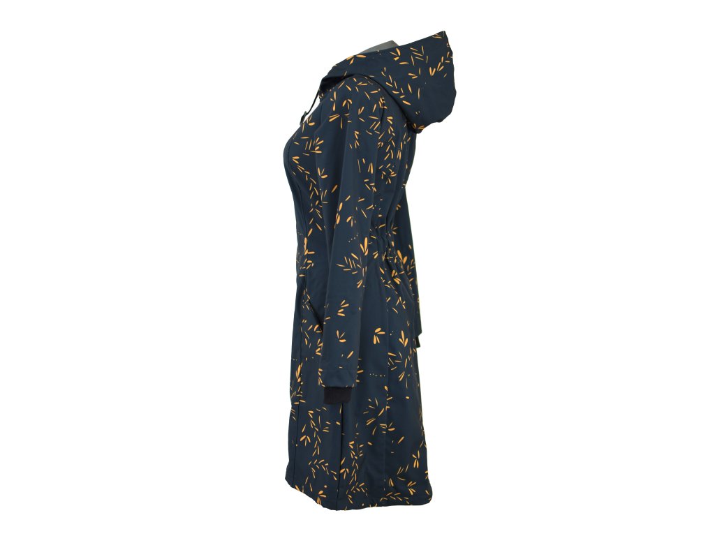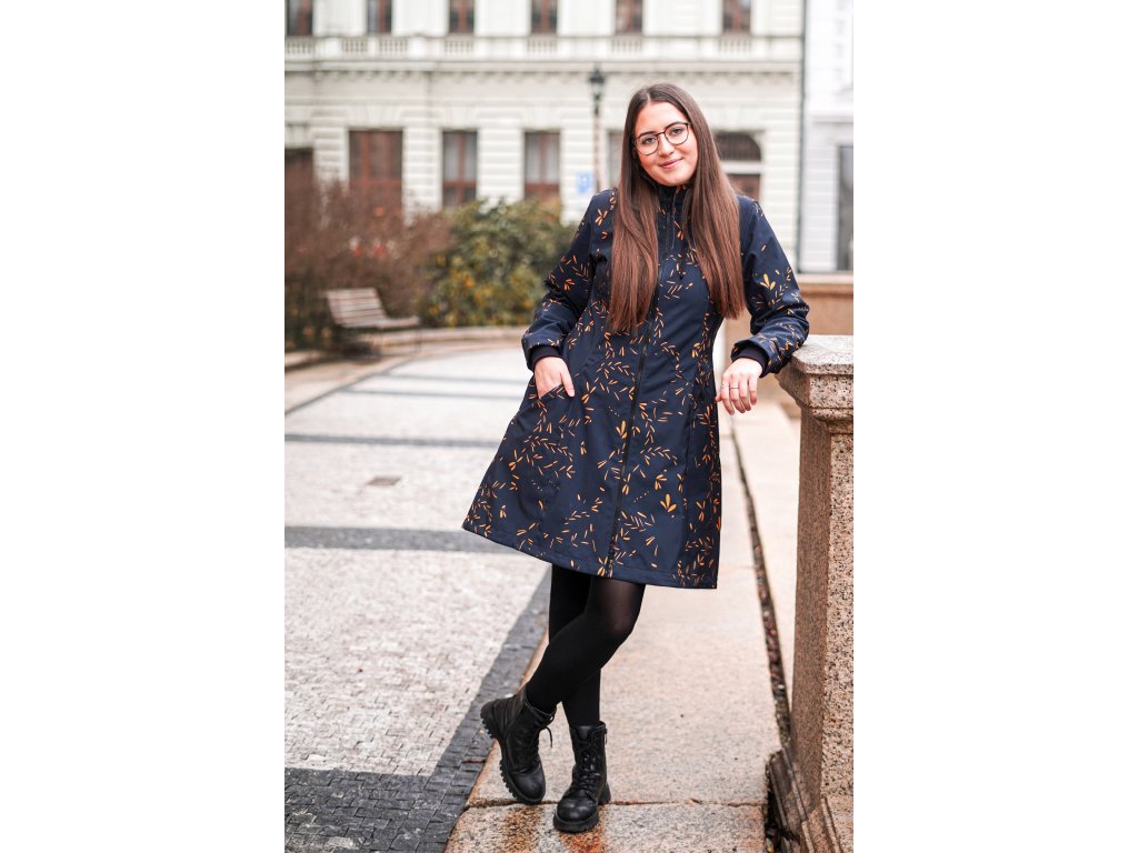 Dámský softshellový kabát áčkového střihu. Střih je projmutý do pasu, zadní díl je stažený do pevně všité gumy. V horní části je úzký, postupně se rozšiřuje. V dolním okraji se dá stáhnout gumičkou na obou stranách. Zadní délka je delší než přední část. Kabátek má oboucestný zip, kapsy na zip - všité na předním díle. Kabát je bez podšívky, z rubu je slabší fleece.