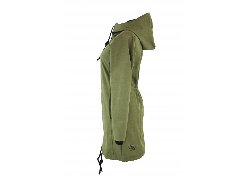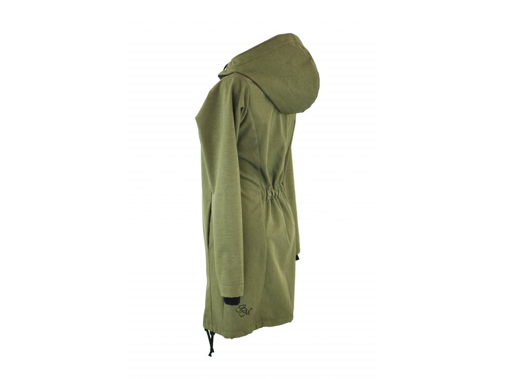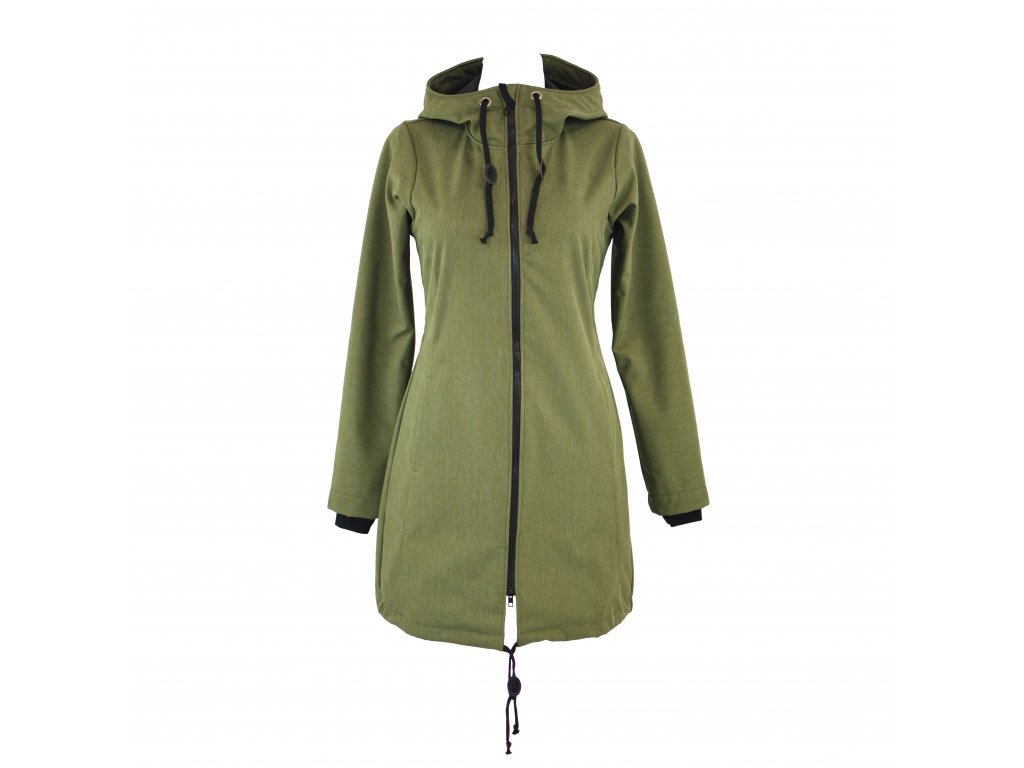 Dámský kabátek rovnějšího prodlouženého střihu s projmutým pasem, který hlavně tvaruje napevno všitá guma na zádech ve středu zadního dílu. Záda jsou nepatrně delší než přední část, spodek zadního dílu se lehce rozšiřuje a dolní lem je dokulata. Ve členícím švu v oblasti boků jsou dvě všité kapsy - kapsový váček a kapsový průhmat je částečně ze softshellu a částečně z bavlněného úpletu, největší kapsy, co jsme doposud u kabátků měli... :)