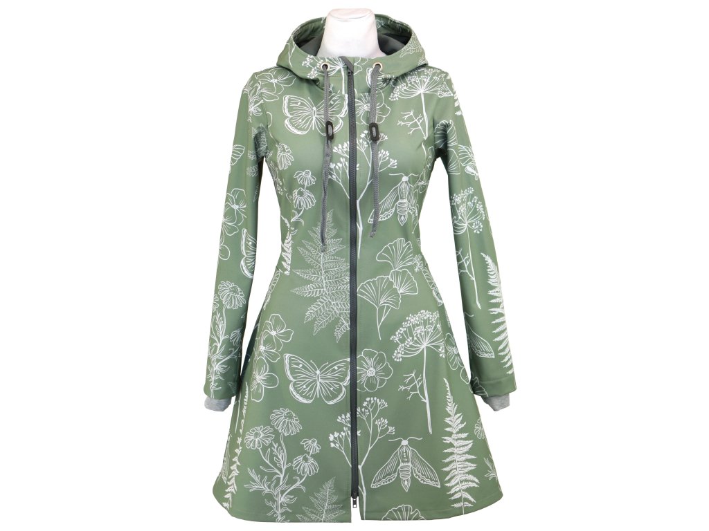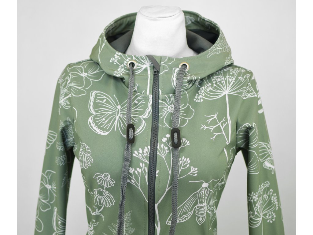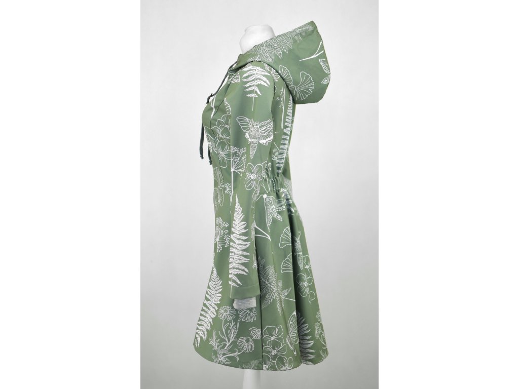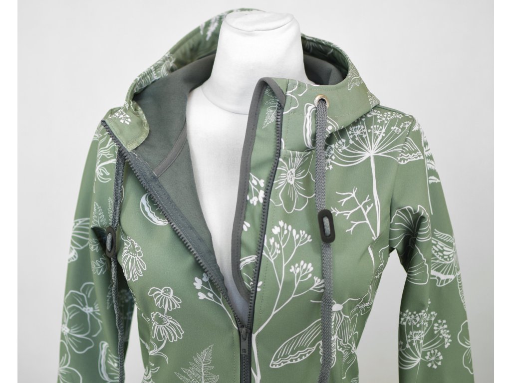 Dámský kabátek s půlkolovou sukní. Střih je projmutý do pasu, zadní díl je stažený do pevně všité gumy. Zádní délka je delší než přední část, spodek zadního dílu se lehce rozšiřuje a dolní lem je dokulata, na zadním díle je vyšité logo. V bočním švu jsou dvě kapsy - kapsový váček a kapsový průhmat je částečně ze softshellu a částečně z bavlněného úpletu (nebo plátna).