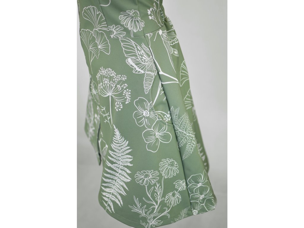Dámský kabátek s půlkolovou sukní. Střih je projmutý do pasu, zadní díl je stažený do pevně všité gumy. Zádní délka je delší než přední část, spodek zadního dílu se lehce rozšiřuje a dolní lem je dokulata, na zadním díle je vyšité logo. V bočním švu jsou dvě kapsy - kapsový váček a kapsový průhmat je částečně ze softshellu a částečně z bavlněného úpletu (nebo plátna).