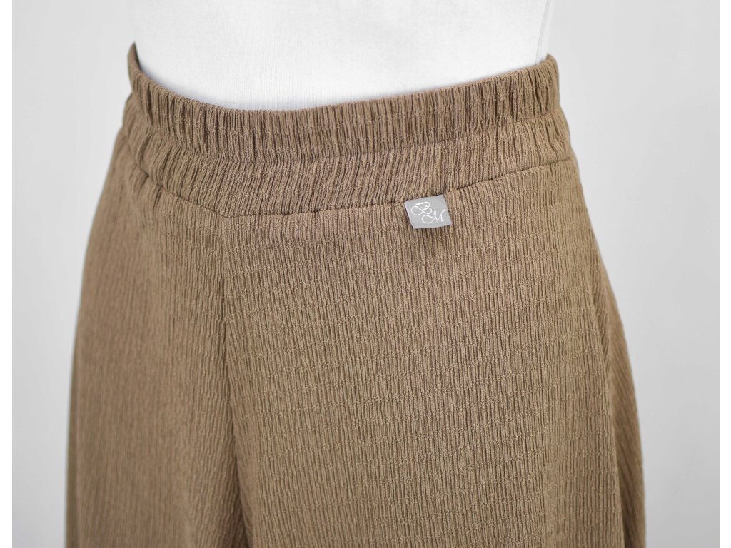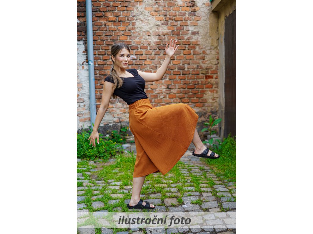 Dámská kalhotová sukně s vysokým sedem a širokými nohavicemi. Má prošitou gumu v pase, nemá kapsy.