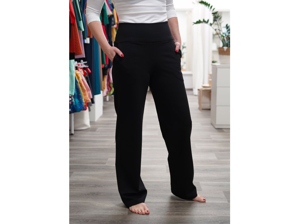 Dámské kalhoty do pasu ze středně silného materiálu. Mají dvě kapsy v bocích, širší rovné nohavice. Jsou velice pohodlné, elastické a přitom stále ležérní. Hodí se do outfitu jak k teniskám, tak lodičkám. Dají se dobře kombinovat s našimi saky.