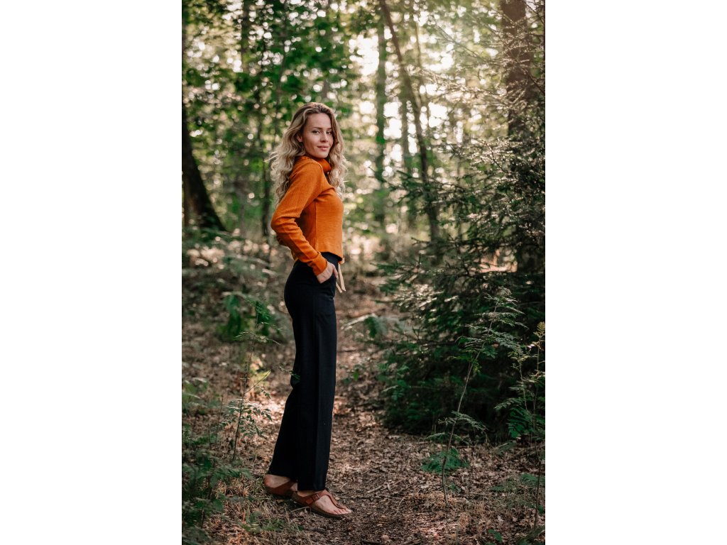 Dámské kalhoty do pasu. Mají dvě kapsy v bocích, širší rovné nohavice. Jsou velice pohodlné, elastické a přitom stále ležérní. Hodí se do outfitu jak k teniskám, tak lodičkám. Dají se dobře kombinovat s našimi saky.