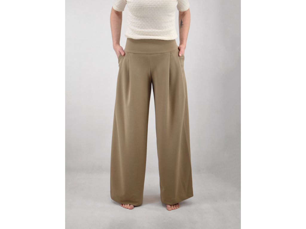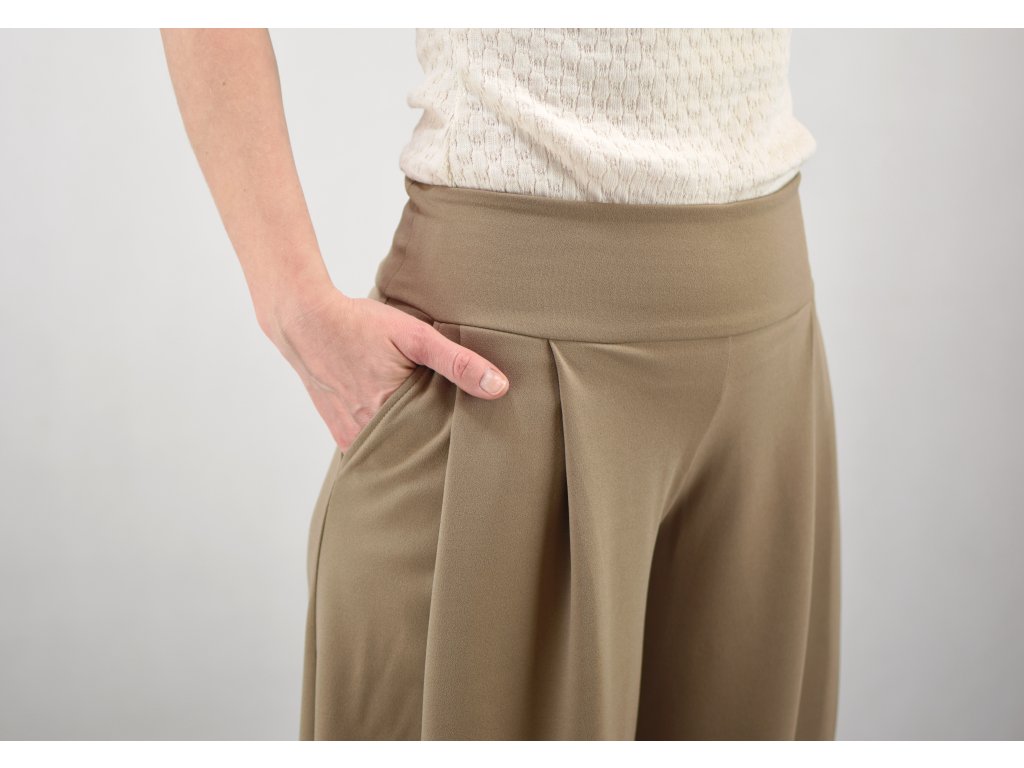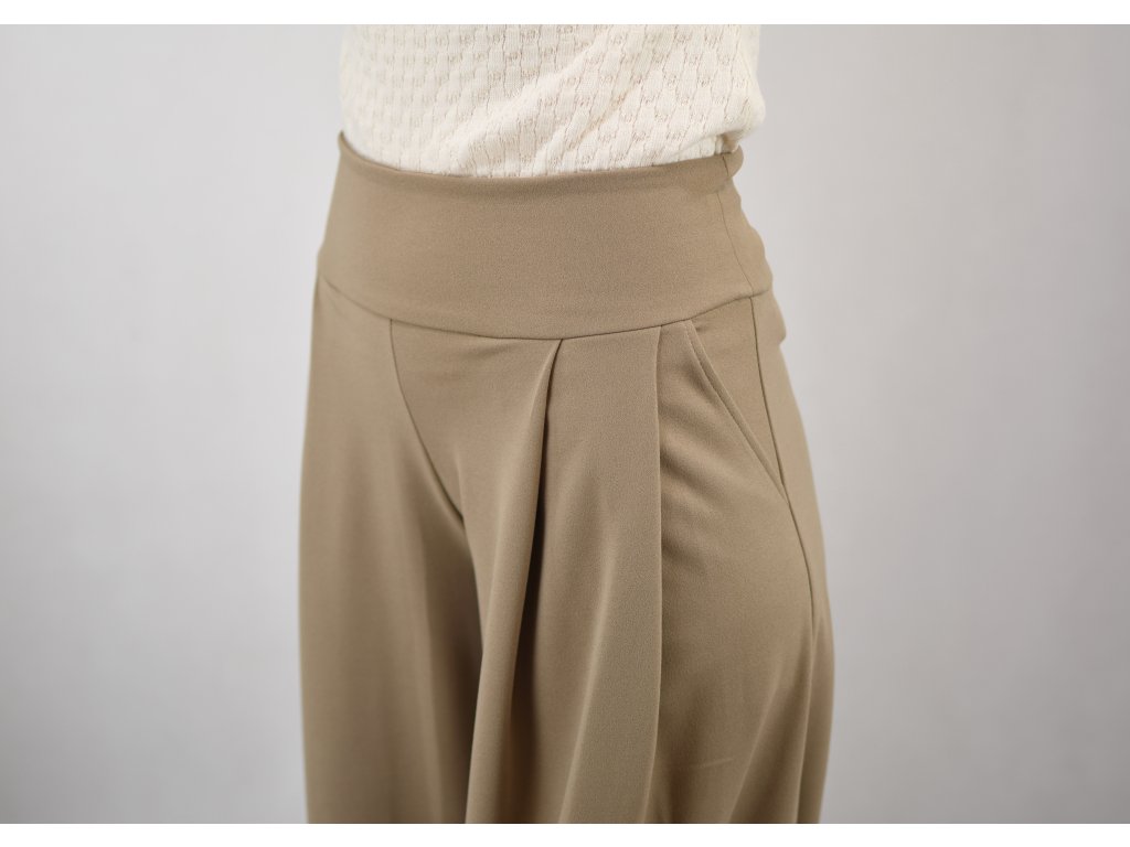 Dámské kalhoty se středně vysokým sedem ze silnějšího materiálu se širokými nohavicemi. Na předním díle mají dva větší sklady, zadní díl je hladký. Mají dvě kapsy v bocích, v pase v zadním díle je všitá gumička pro stažení a pohodlné nošení.