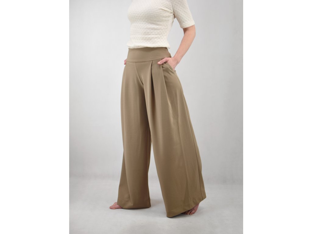 Dámské kalhoty se středně vysokým sedem ze silnějšího materiálu se širokými nohavicemi. Na předním díle mají dva větší sklady, zadní díl je hladký. Mají dvě kapsy v bocích, v pase v zadním díle je všitá gumička pro stažení a pohodlné nošení.