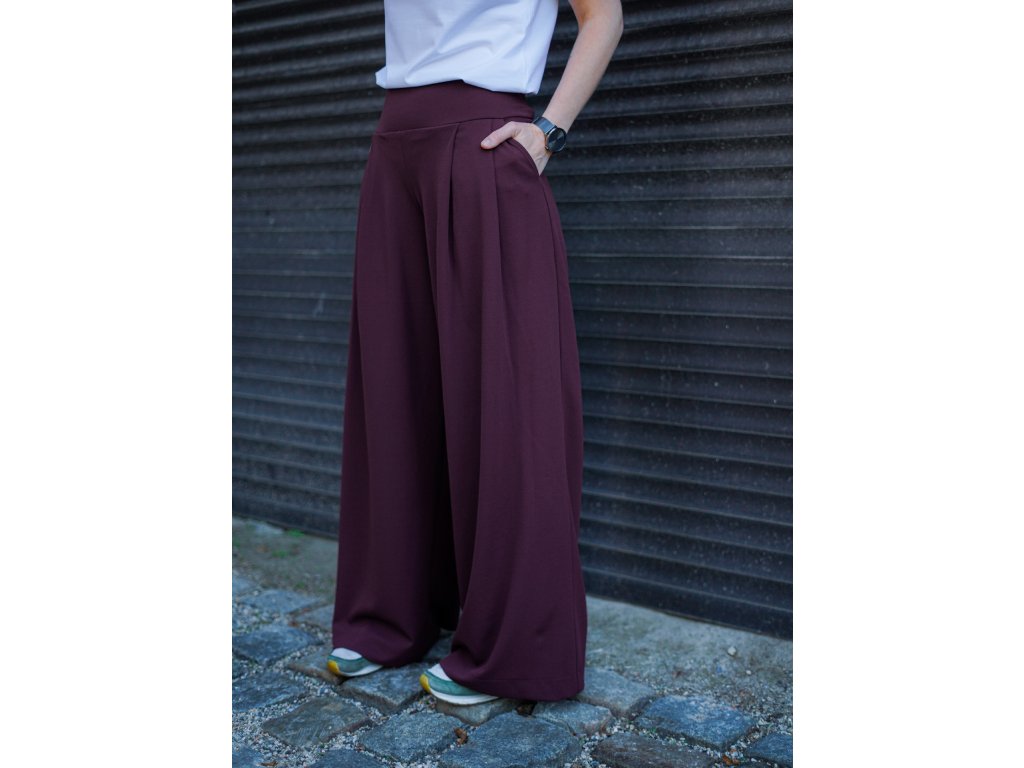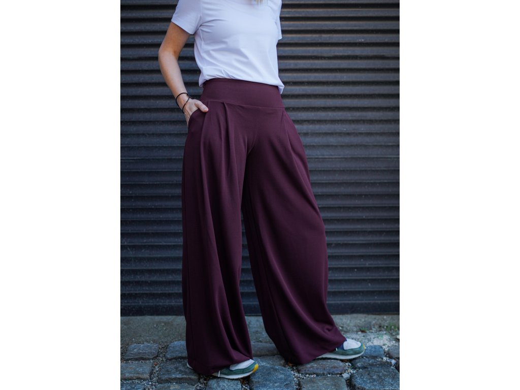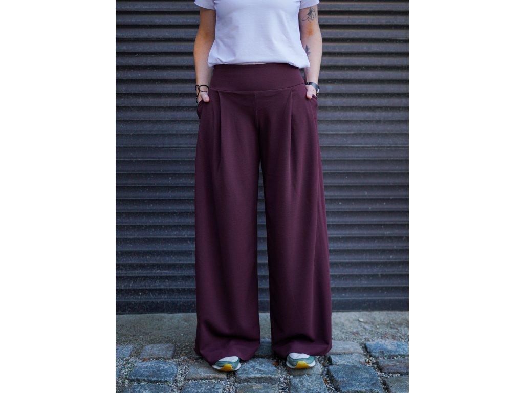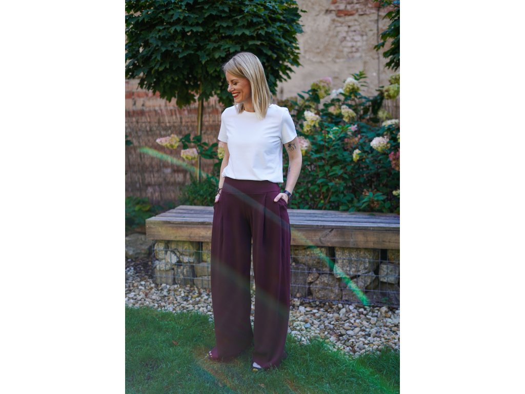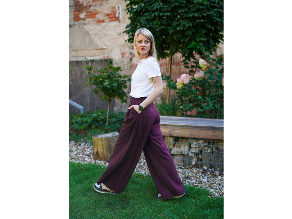 Dámské kalhoty se středně vysokým sedem ze silnějšího materiálu se širokými nohavicemi. Na předním díle mají dva větší sklady, zadní díl je hladký. Mají dvě kapsy v bocích, v pase v zadním díle je všitá gumička pro stažení a pohodlné nošení.