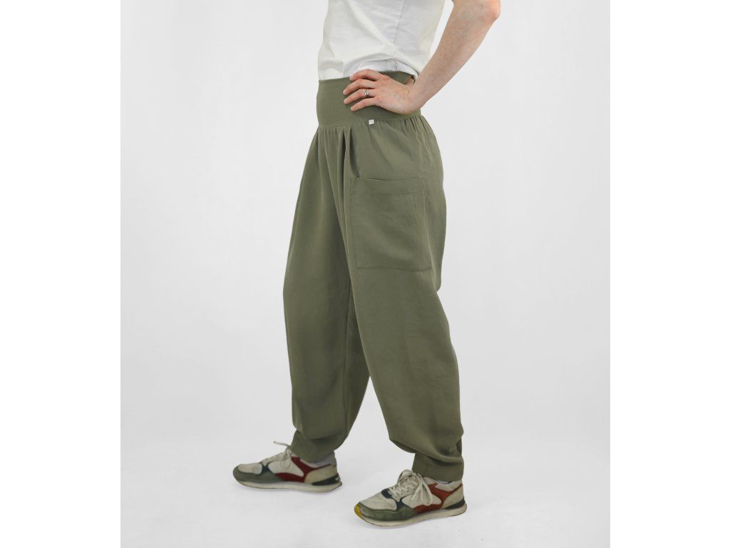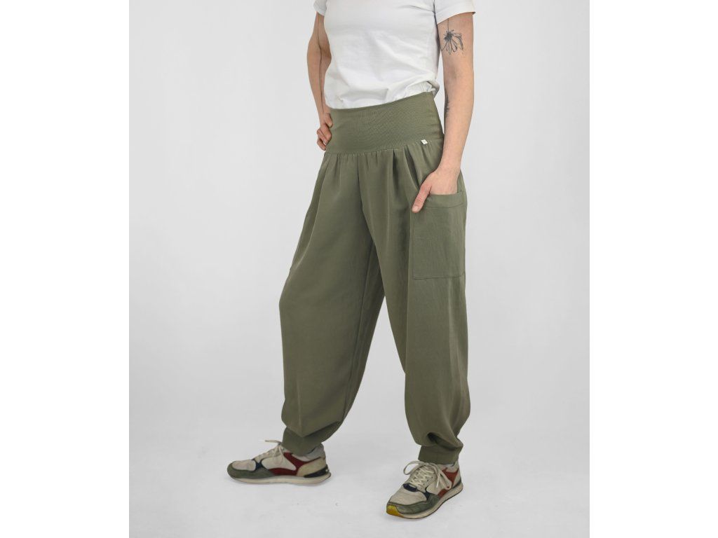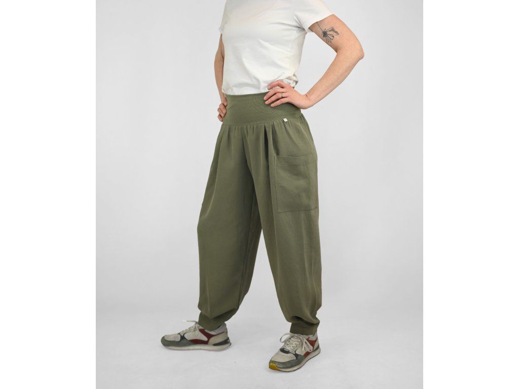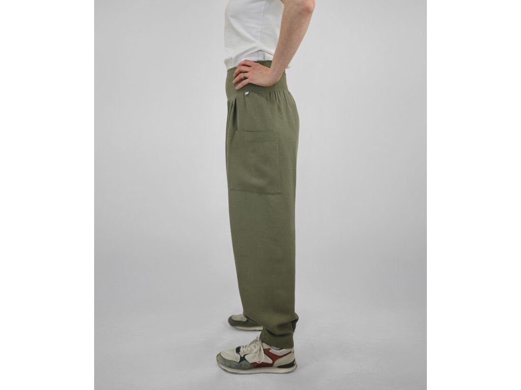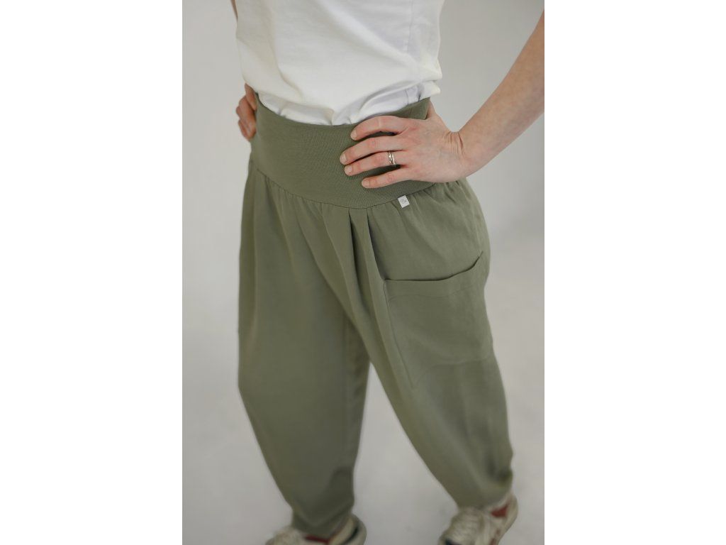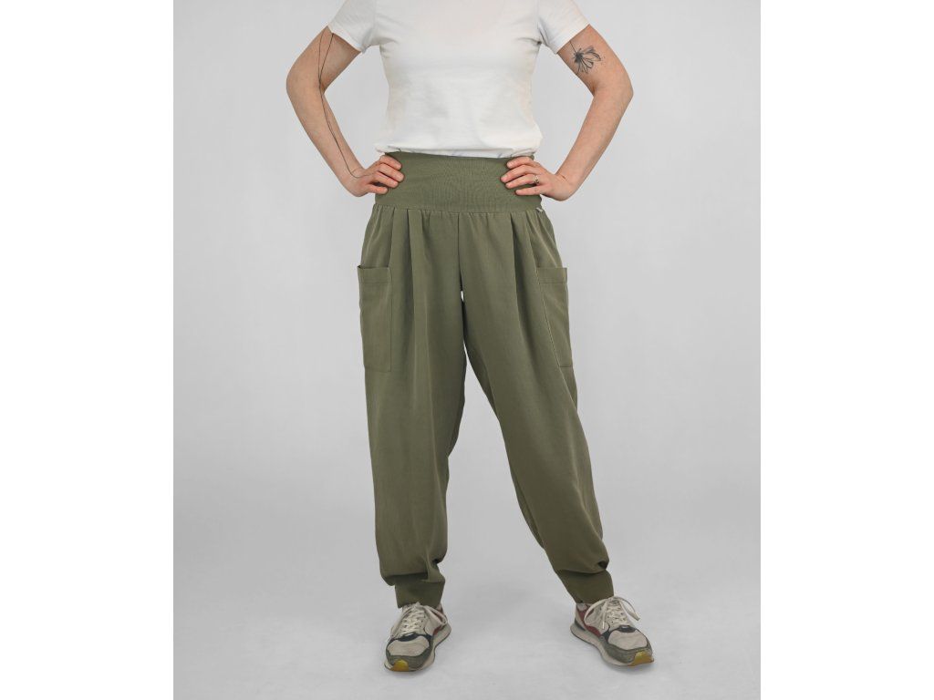 Dámské kalhoty se středně vysokým sedem a širokými nohavicemi ze splývavého materiálu. Pas je tvořen dvojitým elastickým pasovým okrajem, pro příjemné přizpůsobení postavě a pohodlné nošení během celého dne. Na postavě působí lehce, uvolněně a zároveň velmi pohodlně.