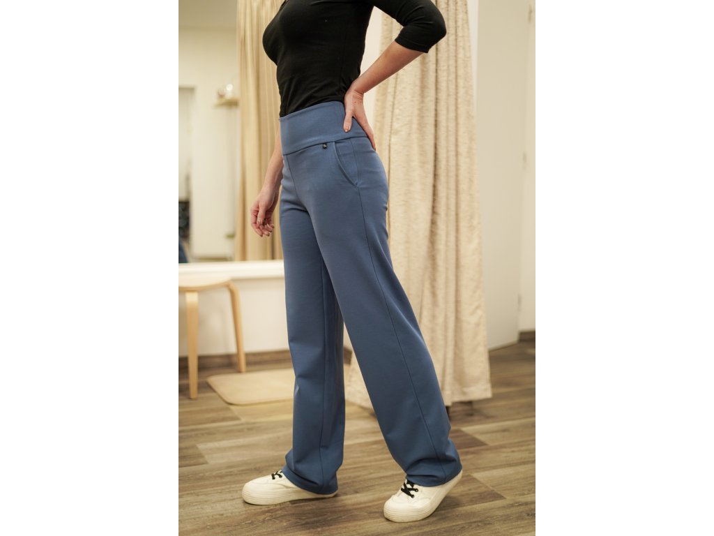 Dámské kalhoty do pasu ze středně silného materiálu. Mají dvě kapsy v bocích, širší rovné nohavice. Jsou velice pohodlné, elastické a přitom stále ležérní. Hodí se do outfitu jak k teniskám, tak lodičkám. Dají se dobře kombinovat s našimi saky.