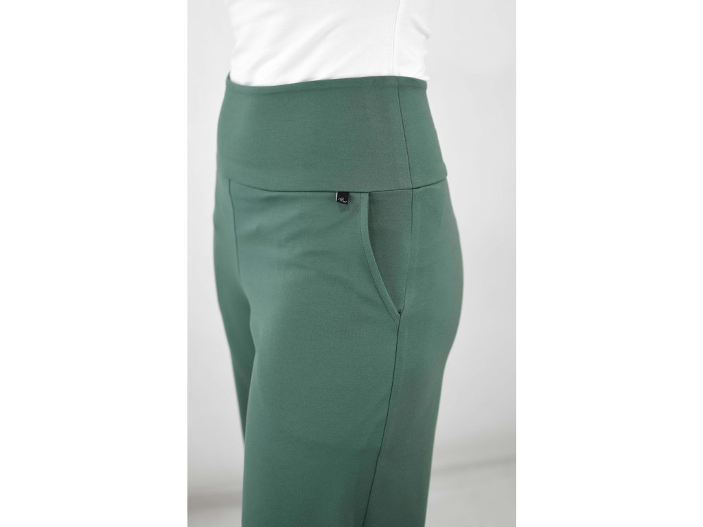 Dámské kalhoty do pasu. Mají dvě kapsy v bocích, širší rovné nohavice. Jsou velice pohodlné, elastické a přitom stále ležérní. Hodí se do outfitu jak k teniskám, tak lodičkám. Dají se dobře kombinovat s našimi saky.