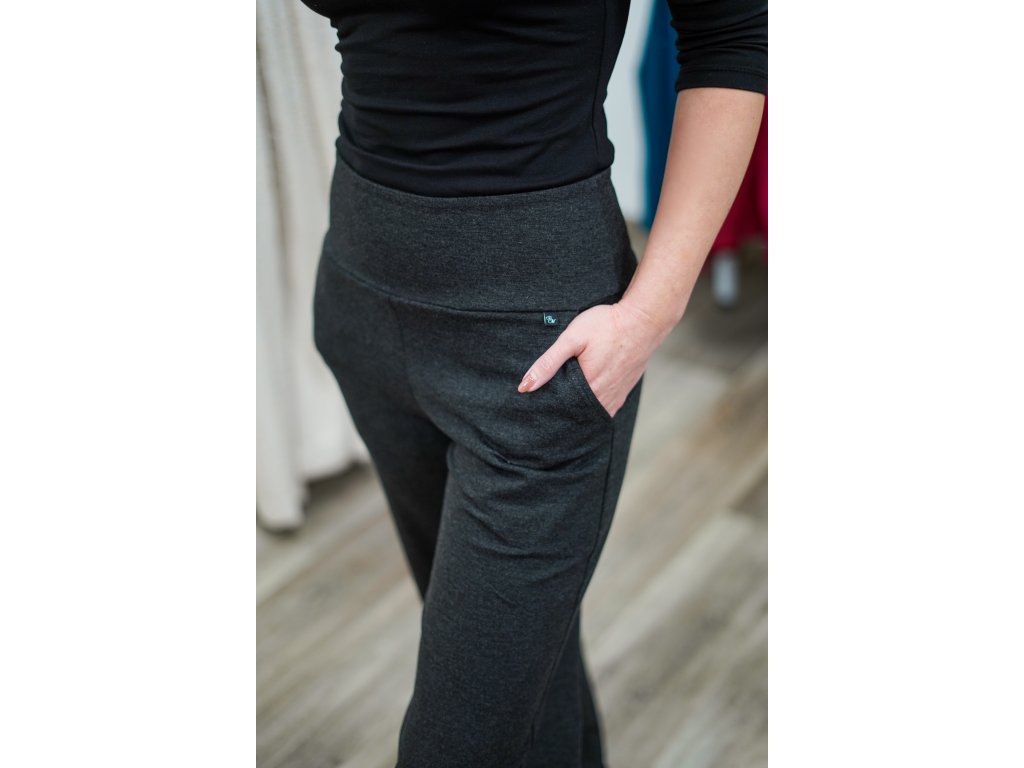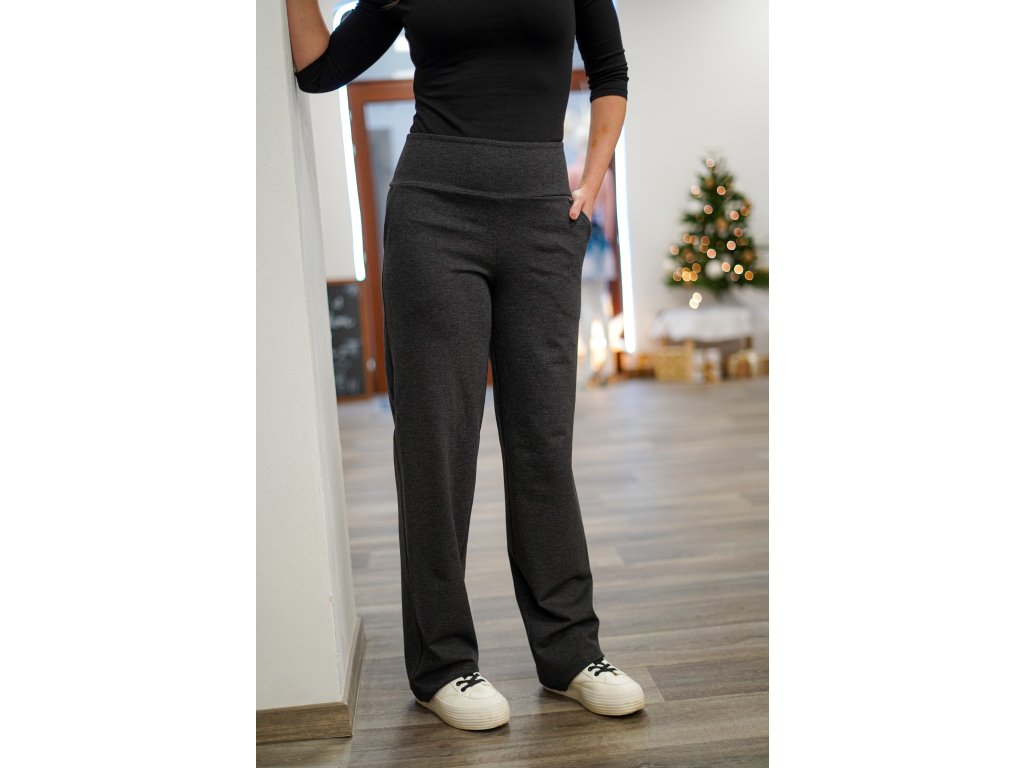Dámské kalhoty do pasu ze středně silného materiálu. Mají dvě kapsy v bocích, širší rovné nohavice. Jsou velice pohodlné, elastické a přitom stále ležérní. Hodí se do outfitu jak k teniskám, tak lodičkám. Dají se dobře kombinovat s našimi saky.