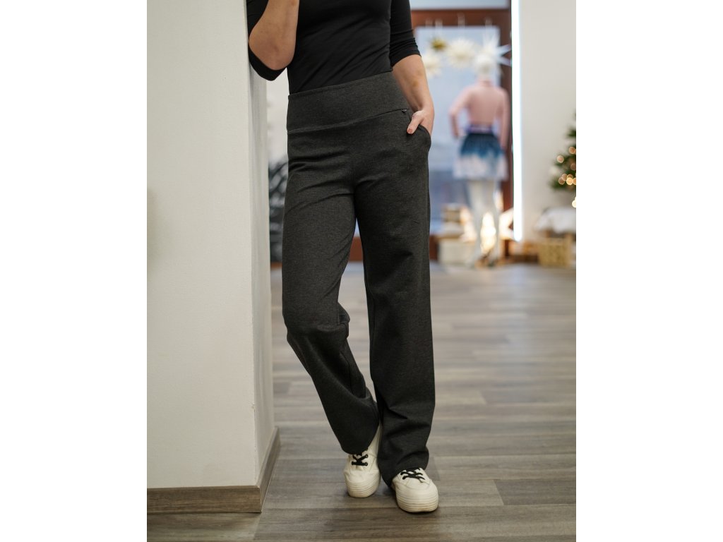 Dámské kalhoty do pasu ze středně silného materiálu. Mají dvě kapsy v bocích, širší rovné nohavice. Jsou velice pohodlné, elastické a přitom stále ležérní. Hodí se do outfitu jak k teniskám, tak lodičkám. Dají se dobře kombinovat s našimi saky.