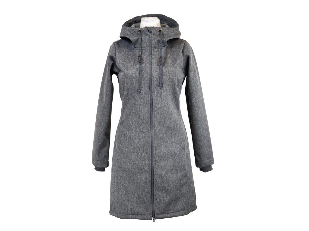 Dámský kabátek rovnějšího prodlouženého střihu s projmutým pasem, který hlavně tvaruje napevno všitá guma na zádech ve středu zadního dílu. Záda jsou nepatrně delší než přední část, spodek zadního dílu se lehce rozšiřuje a dolní lem je dokulata. Kapsy na zip jsou všité na předním díle. Kabát je bez podšívky, z rubu je slabší fleece. Zip je oboucestný a je u límce oddělen chráničem brady.