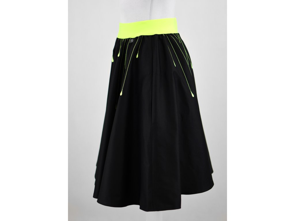Dámská sukně s elastickou gumou do pasu, kolového střihu se skrytými kapsami v bocích a podšívkou. Sukně je hodně bohatá, objemná a krásně se točí… :) Guma v pase je neonové žluté barvy a nemá poutka.