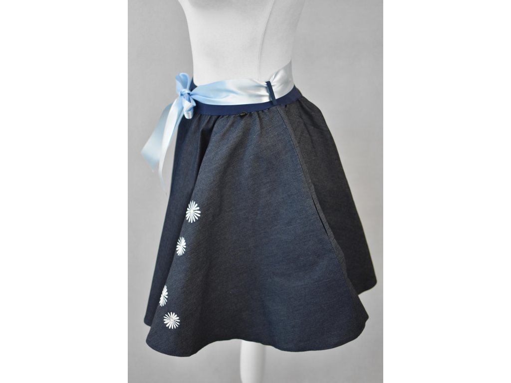 Dámská sukně kolového střihu s elastickou gumou. Má podšívku, skryté kapsy a poutka v pase na protažení ozdobné mašle. Sukně je hodně bohatá, objemná a krásně se točí… :)