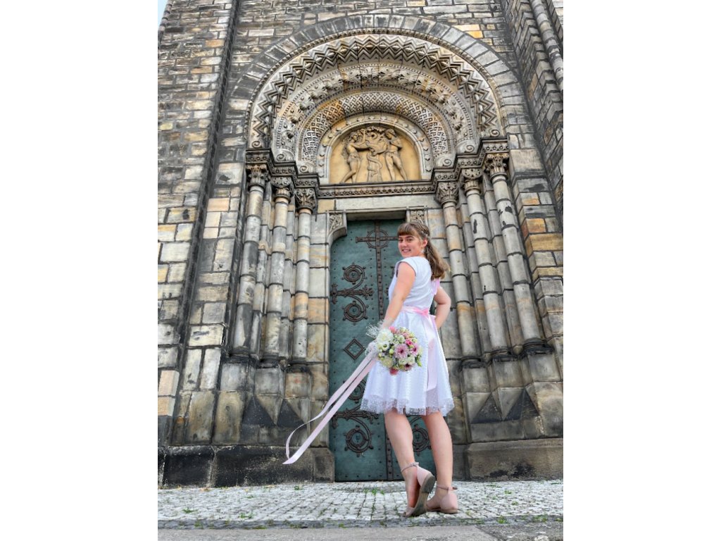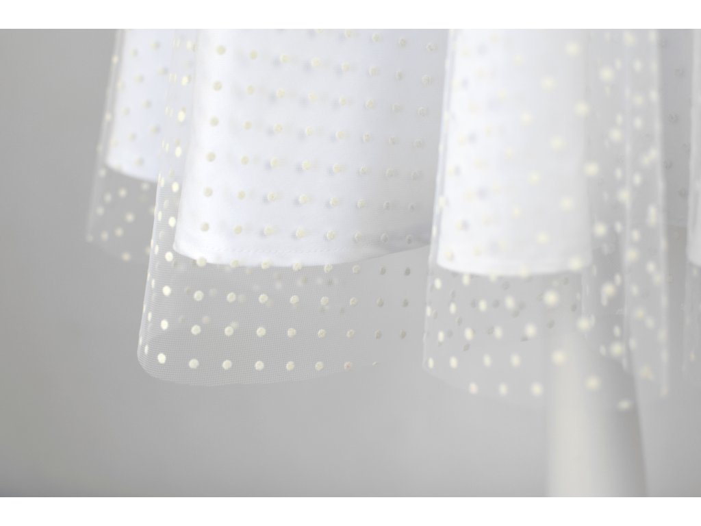 Barva šatů je bílá, barva puntíků na tylu smetanová.